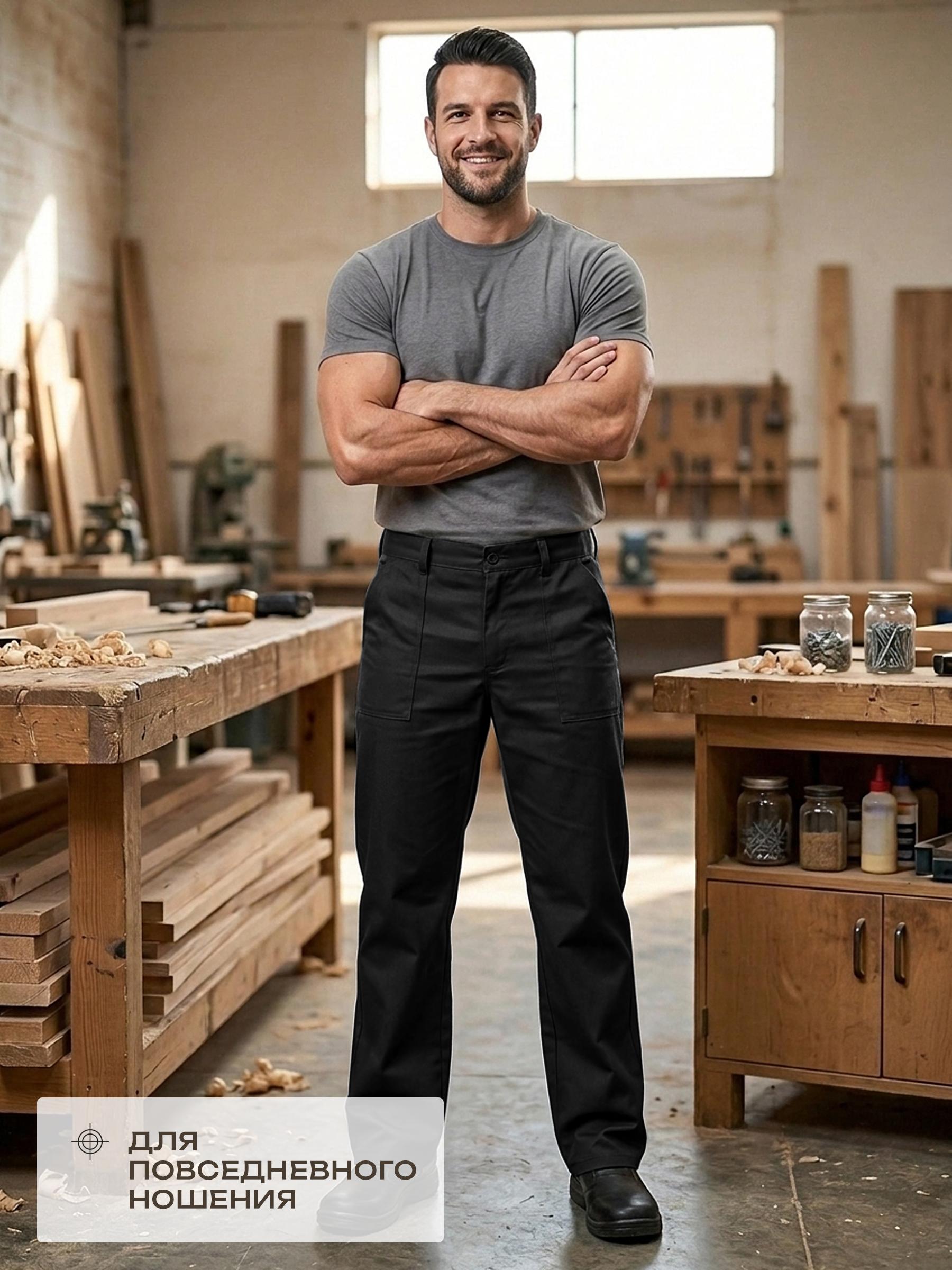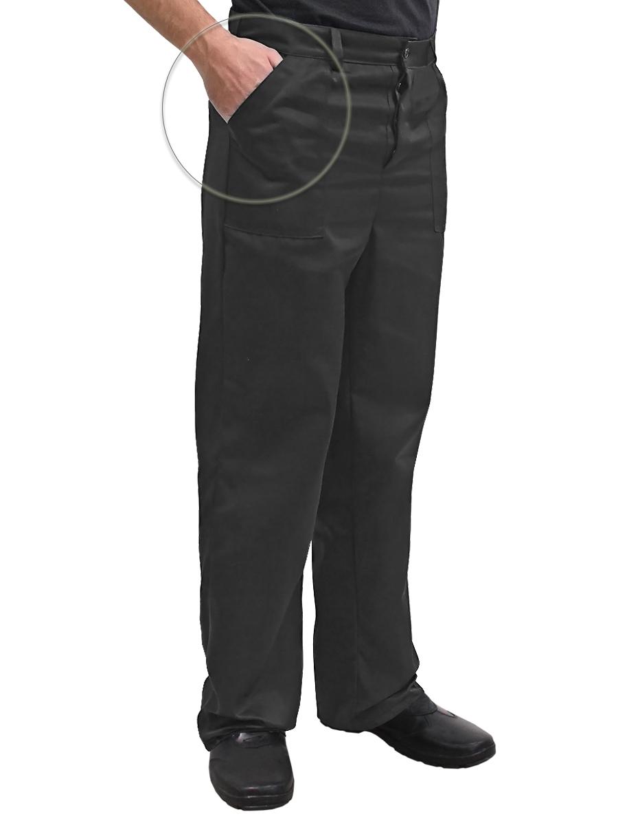 Брюки прямые, с цельнокроеным поясом со шлевками, с застёжкой на петли и пуговицы. Передние половинки брюк с боковыми нашивными карманами. Используется как рабочая одежда. Рекомендуемые материалы: смесовые ткани ГОСТ 25295-2003