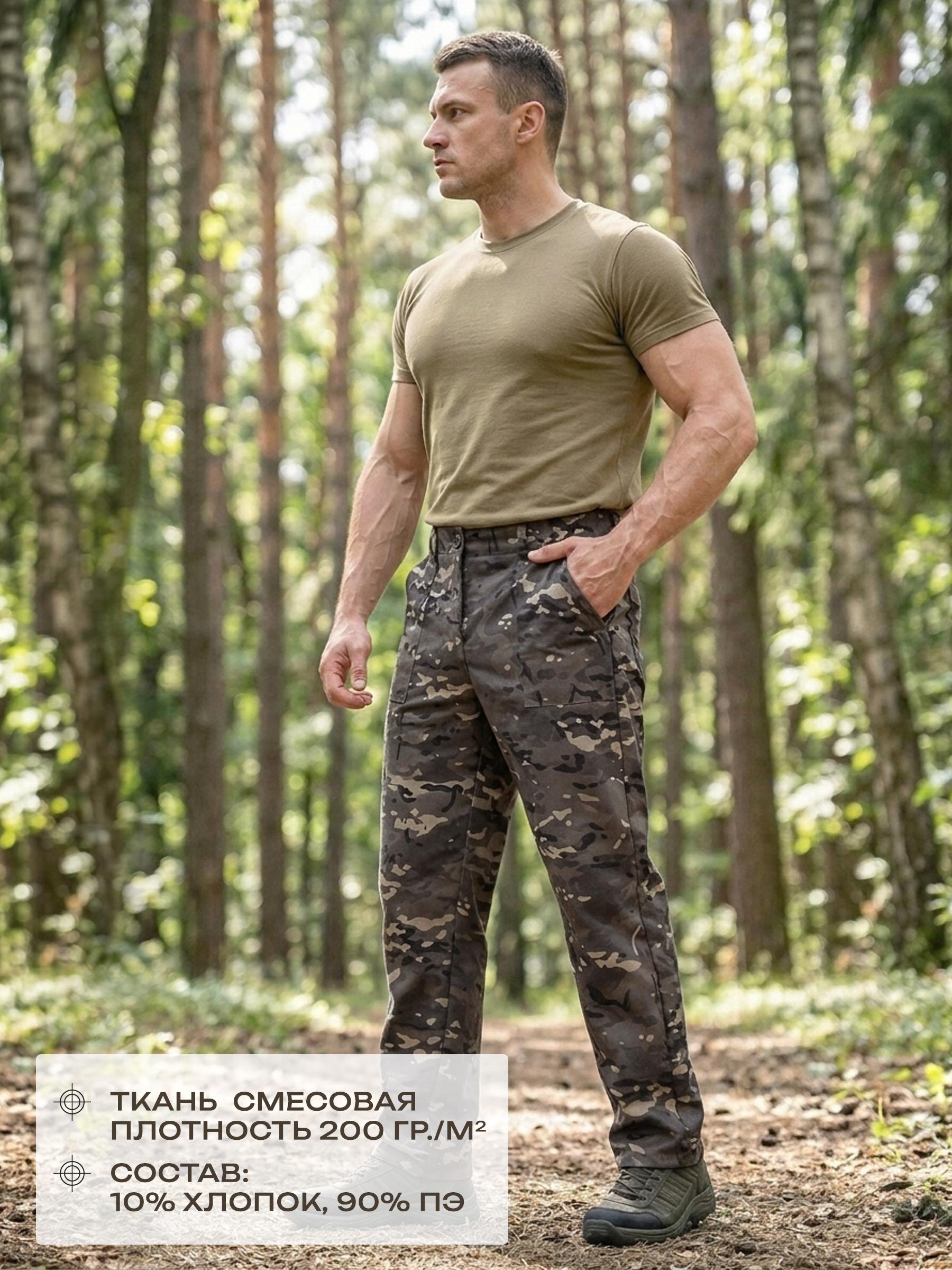 Брюки прямые, с цельнокроеным поясом со шлевками, с застёжкой на петли и пуговицы. Передние половинки брюк с боковыми нашивными карманами. Рекомендуемые материалы: смесовые ткани ГОСТ 25295-2003