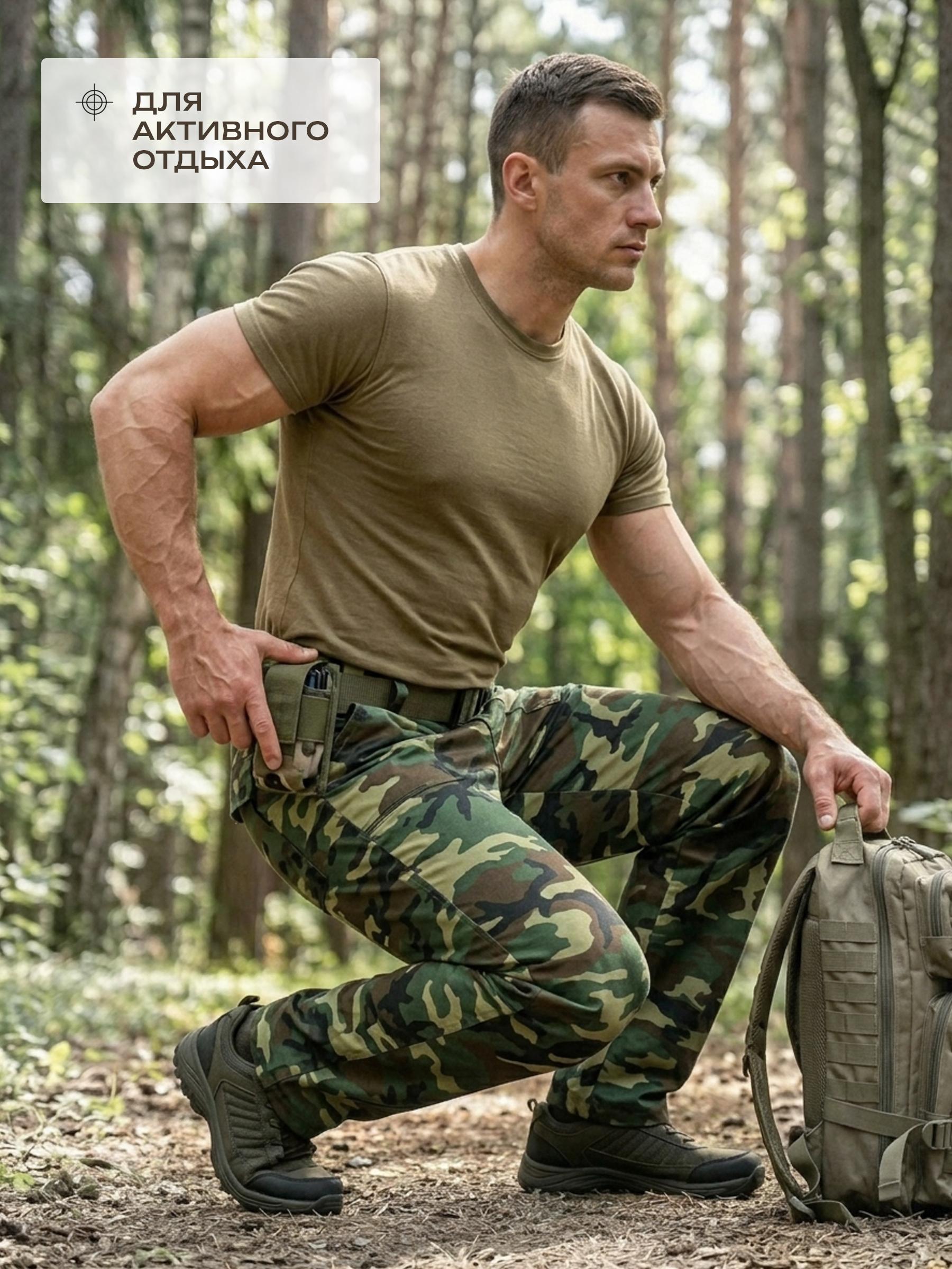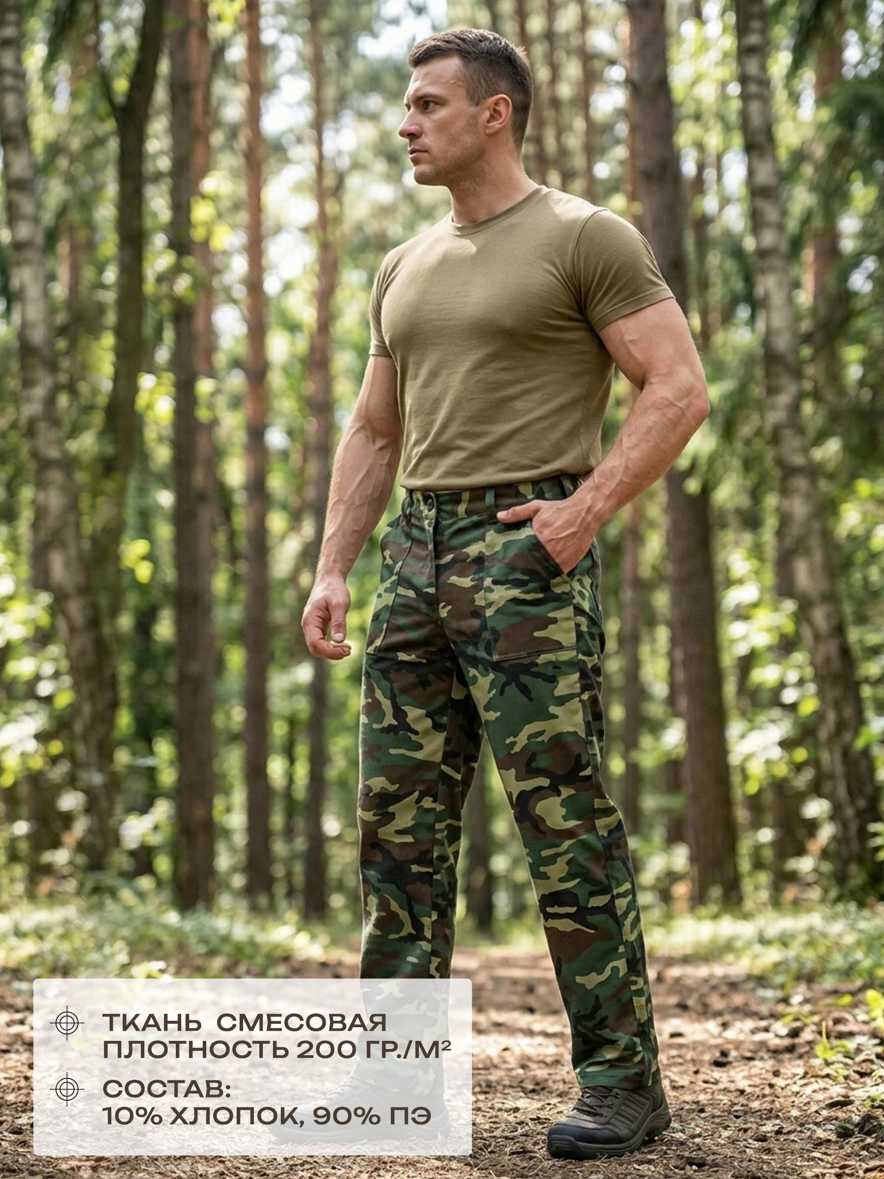 Брюки прямые, с цельнокроеным поясом со шлевками, с застёжкой на петли и пуговицы. Передние половинки брюк с боковыми нашивными карманами. Рекомендуемые материалы: смесовые ткани ГОСТ 25295-2003