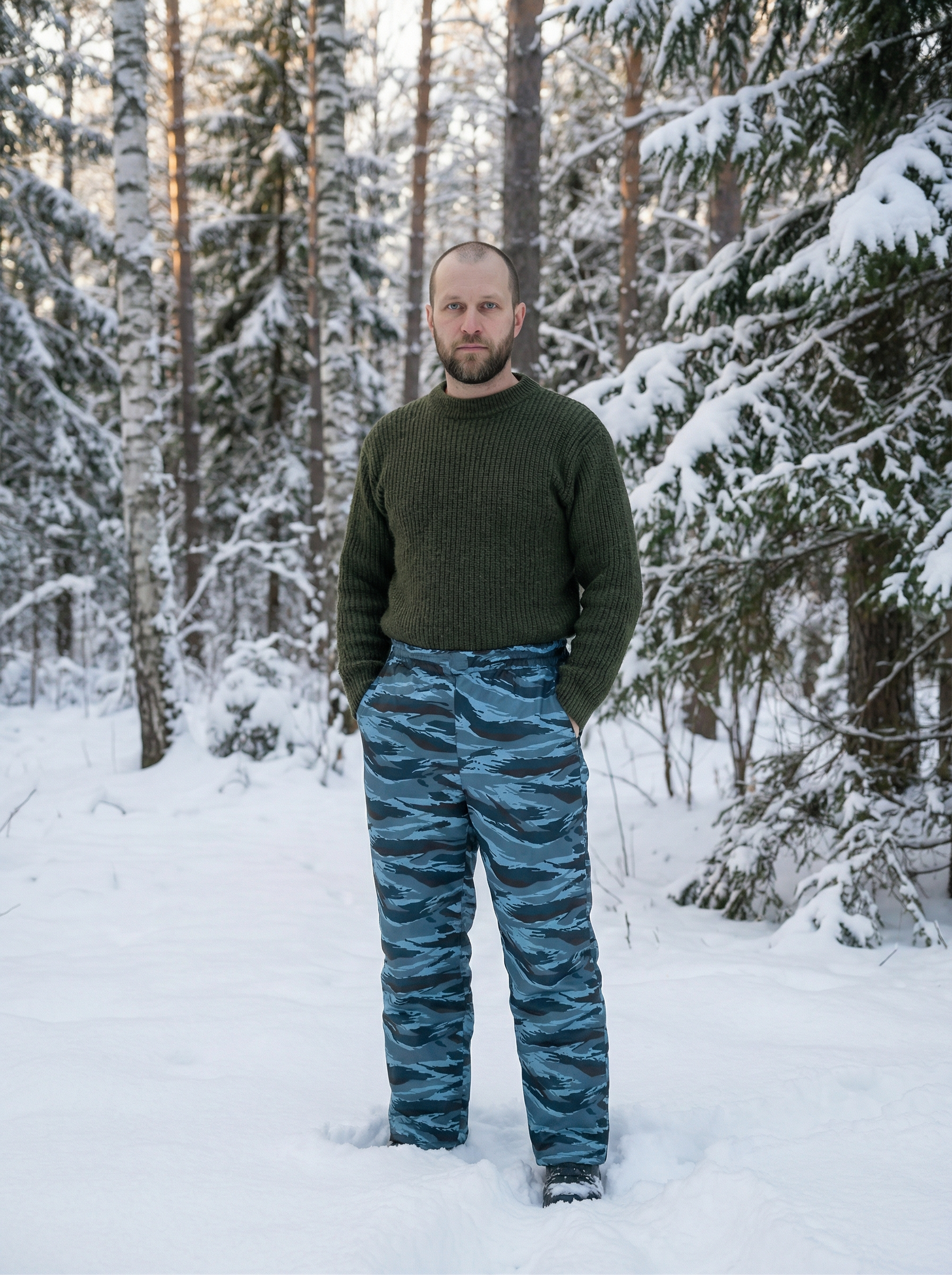 Утепленные брюки с камуфляжным принтом подходят для длительного пребывания на природе или улице в холодное время года. Материал верха - оксфорд, плотная ткань из полиэфира с водоотталкивающим эффектом, утеплитель - синтепон, в верхней части в два, от колена - в один слой, подкладка из полиэстера. Пояс притачной, стянут эластичной тесьмой. Имеются боковые карманы с отрезным бочком. Благодаря сочетанию материалов и особенностям пошива брюки удобны, отлично защищают от холода и ветра, не впитывают влагу во время осадков или при ходьбе по снегу. Соответствуют ГОСТ 25295-2003.