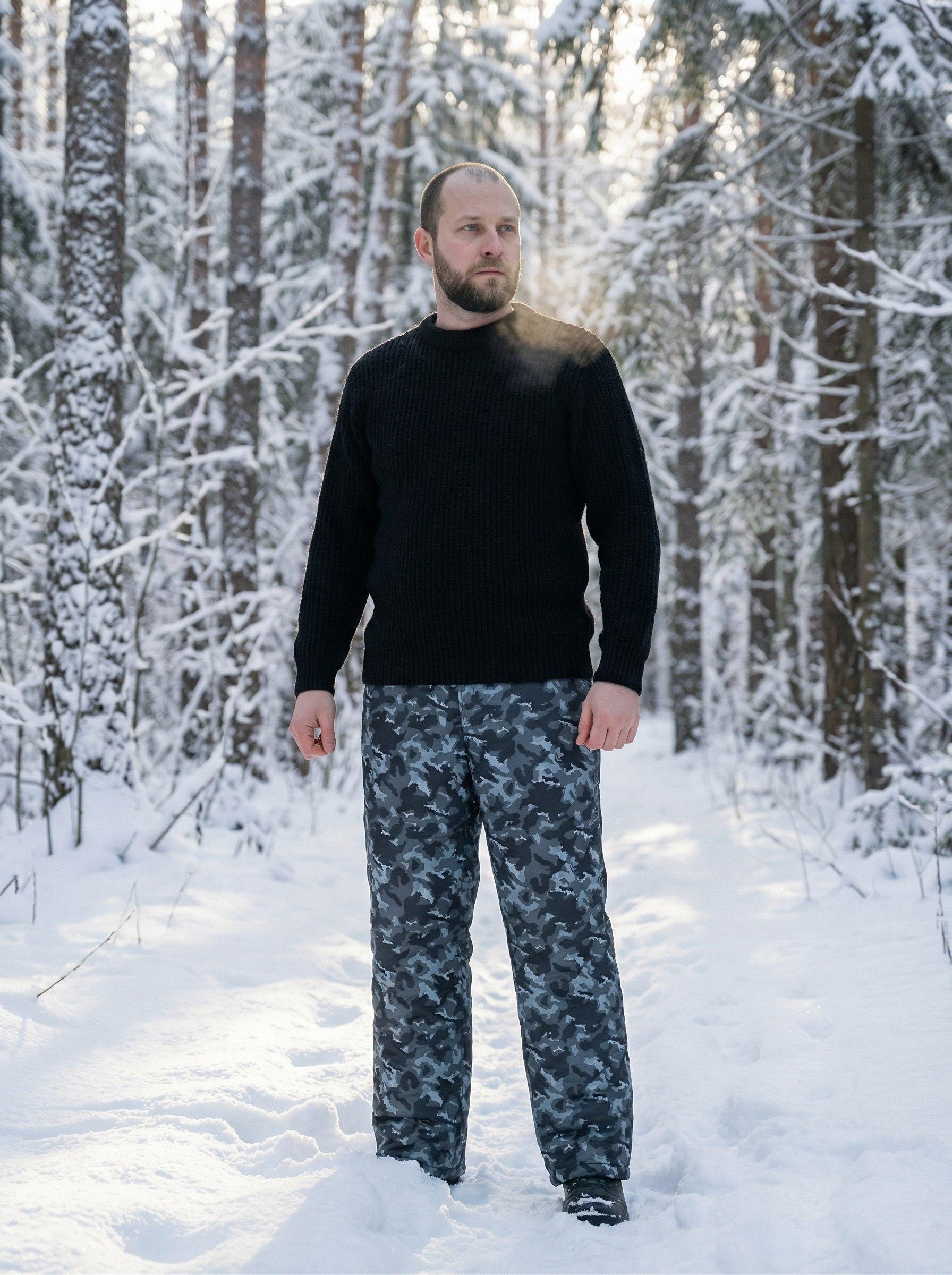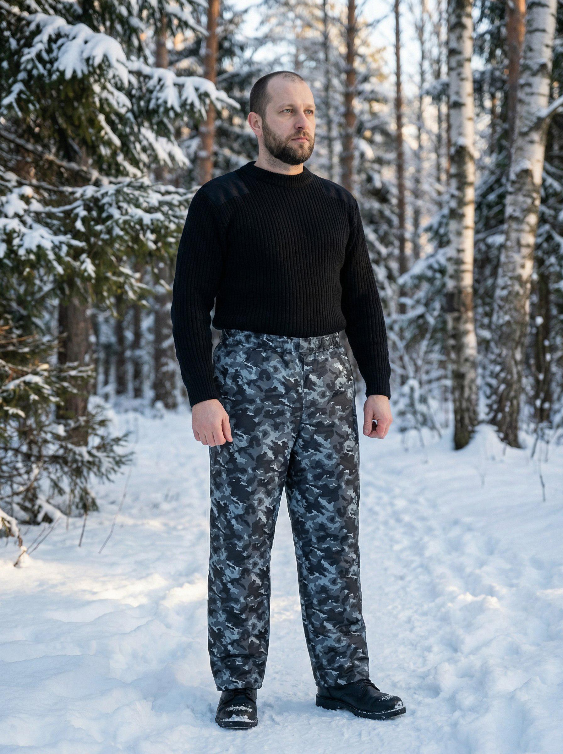 Утепленные брюки с камуфляжным принтом подходят для длительного пребывания на природе или улице в холодное время года. Материал верха - оксфорд, плотная ткань из полиэфира с водоотталкивающим эффектом, утеплитель - синтепон, в верхней части в два, от колена - в один слой, подкладка из полиэстера. Пояс притачной, стянут эластичной тесьмой. Имеются боковые карманы с отрезным бочком. Благодаря сочетанию материалов и особенностям пошива брюки удобны, отлично защищают от холода и ветра, не впитывают влагу во время осадков или при ходьбе по снегу. Соответствуют ГОСТ 25295-2003.