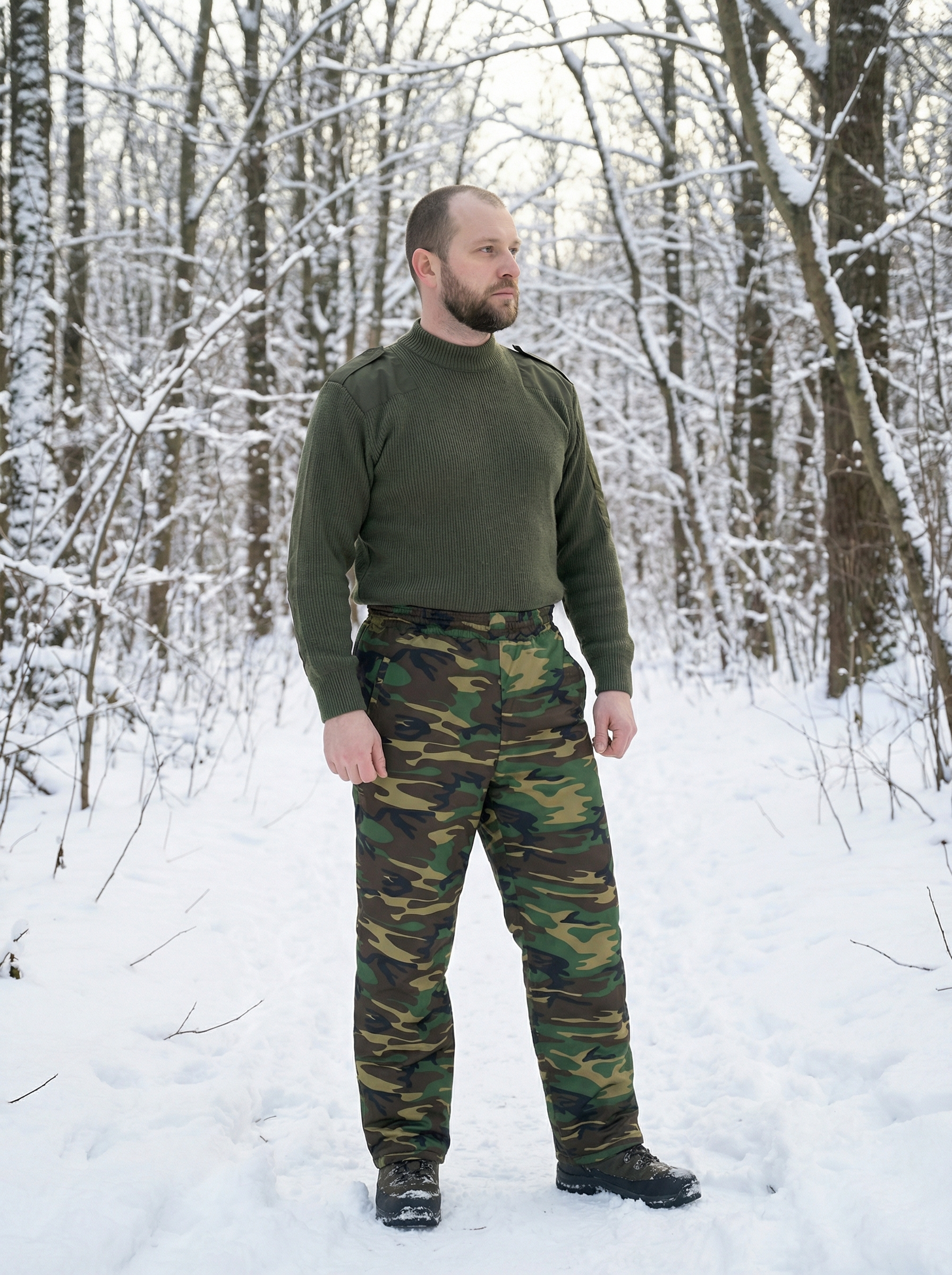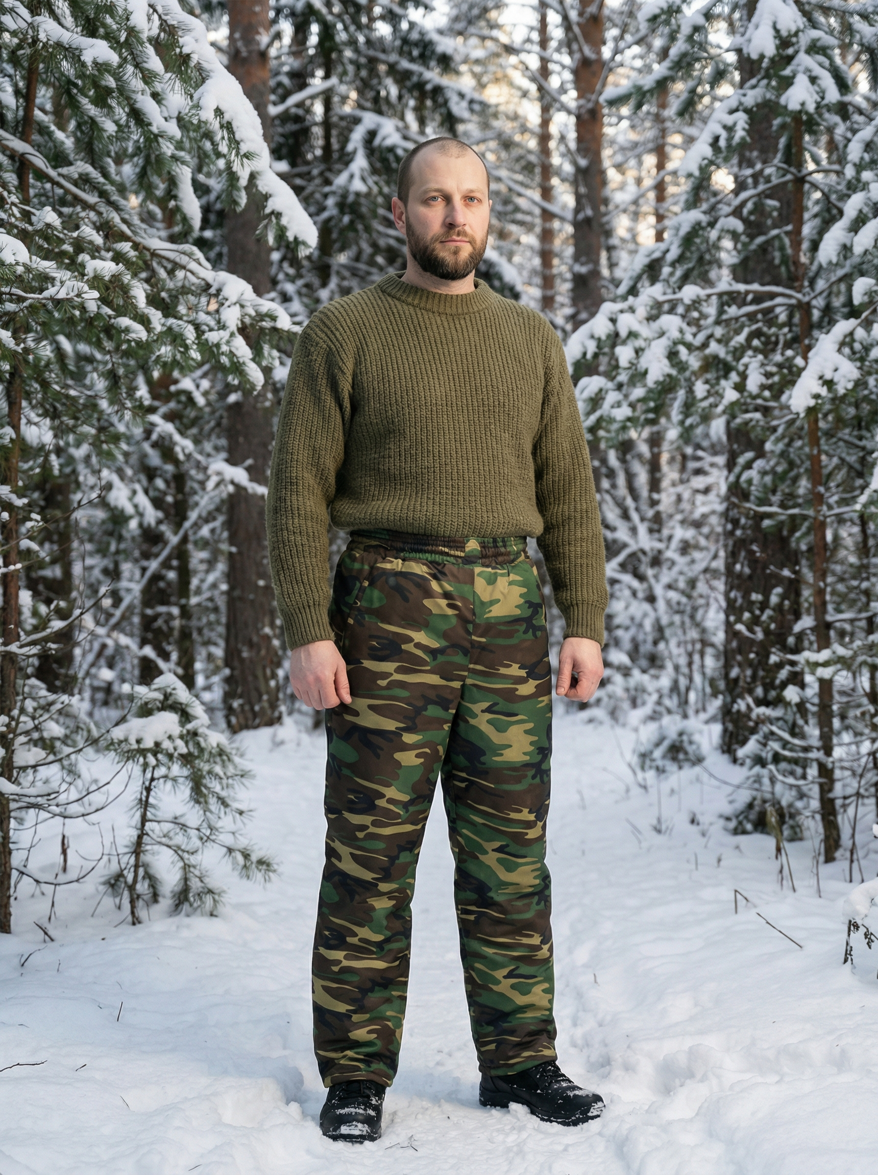 Утепленные брюки с камуфляжным принтом подходят для длительного пребывания на природе или улице в холодное время года. Материал верха – смесовка (48% хл., 52% пэф) плотная ткань, утеплитель - синтепон, в верхней части в два, от колена - в один слой, подкладка из полиэстера. Пояс притачной, стянут эластичной тесьмой. Имеются боковые карманы с отрезным бочком. Благодаря сочетанию материалов и особенностям пошива брюки удобны, отлично защищают от холода и ветра, не впитывают влагу во время осадков или при ходьбе по снегу. Соответствуют ГОСТ 25295-2003.