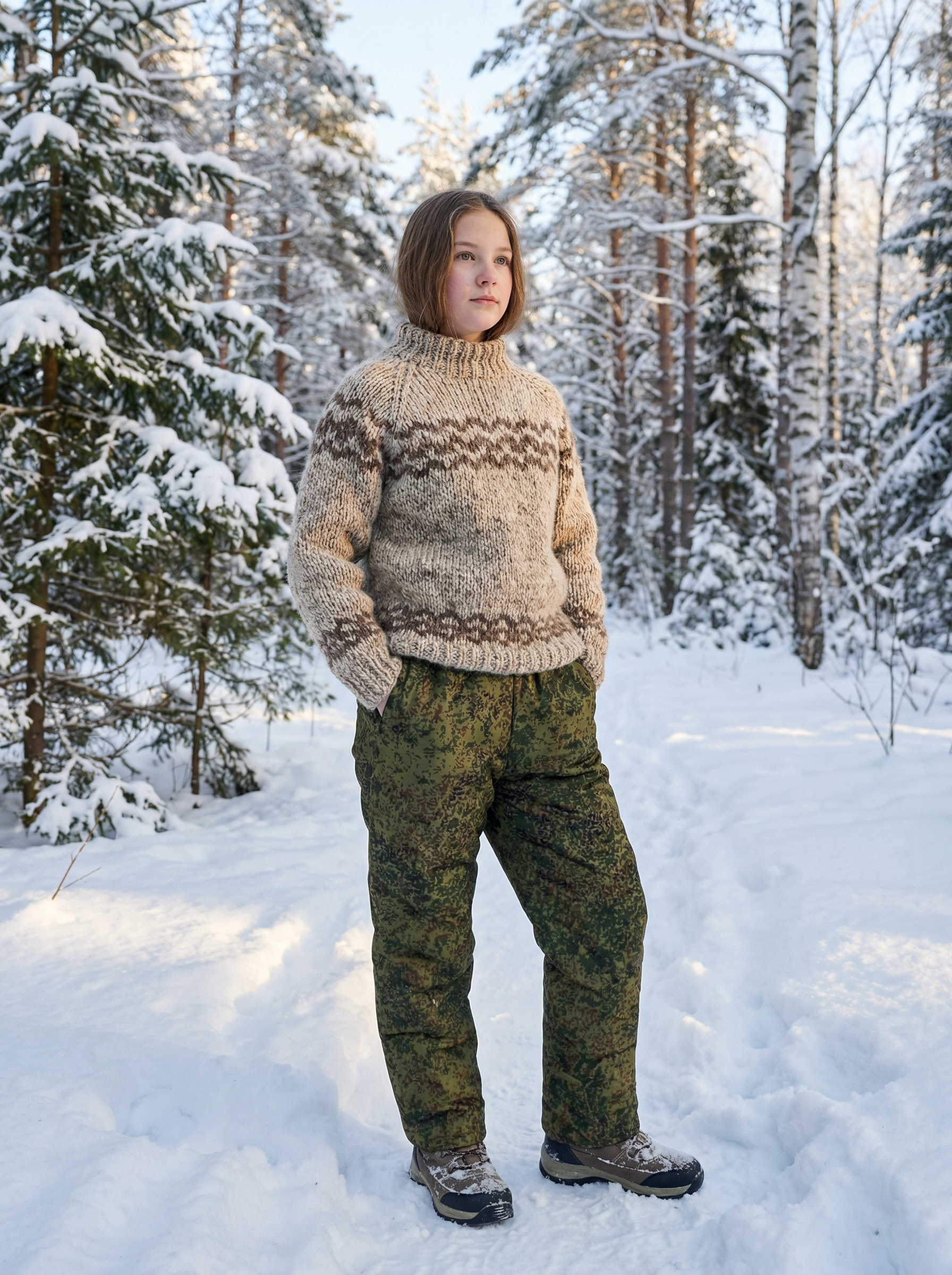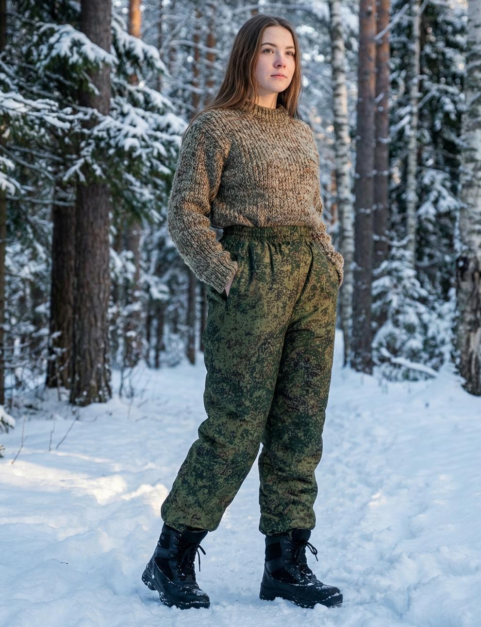 Зелёные утеплённые брюки на притачном поясе, стянутом эластичной тесьмой, и карманами с отрезным бочком. Камуфляжные брюки утеплены двумя слоями синтепона, под коленом - одним. Рекомендуемые материалы: Смесовые ткани и плащевые ткани с пропиткой ВО. ГОСТ 25295-2003
