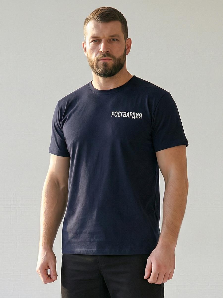 Классическая модель футболки, прямой покрой. Горловина обработана рибаной. На левой стороне груди и на спине термотрансферной печатью выполнена надпись «РОСГВАРДИЯ». Рекомендуемые материалы: кулирка с лайкрой: хлопок-95 %, лайкра - 5% ГОСТ 31408-2009
