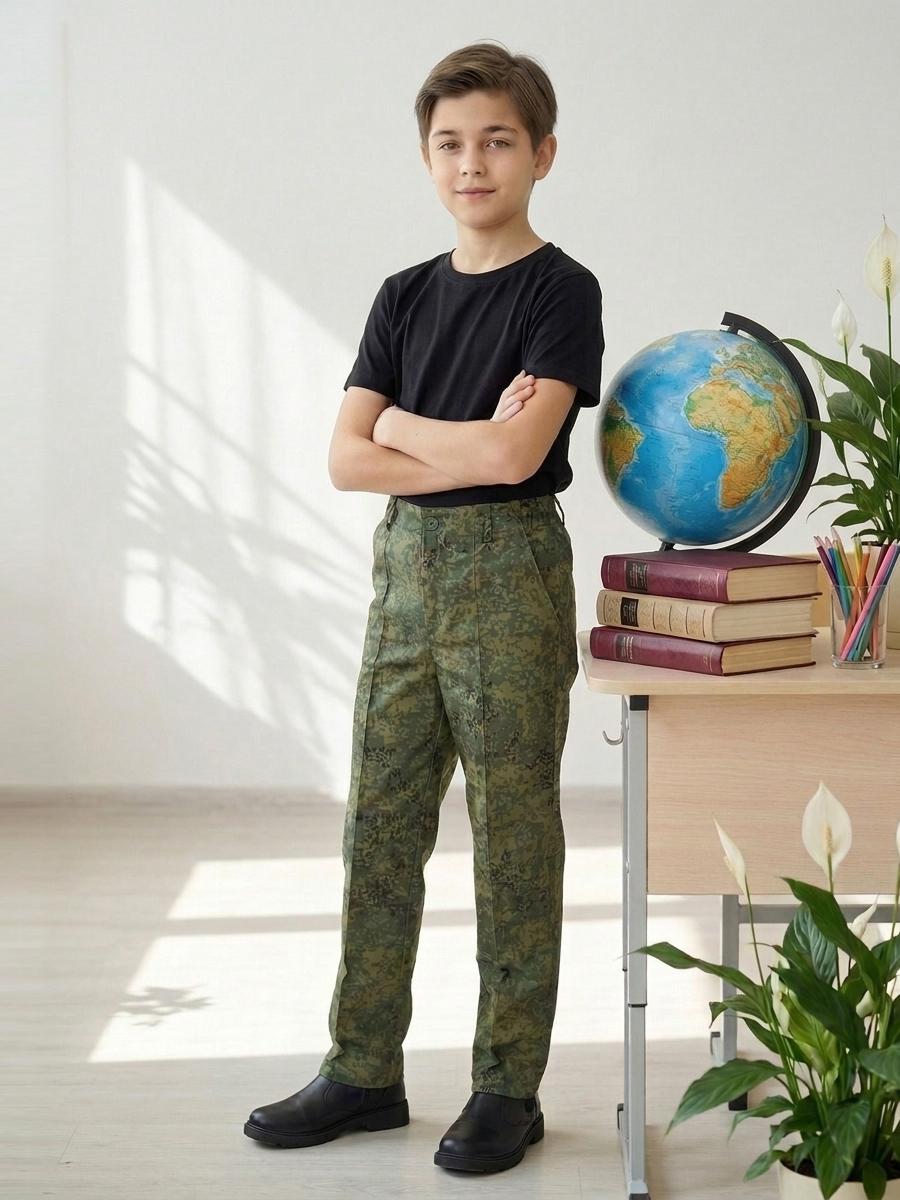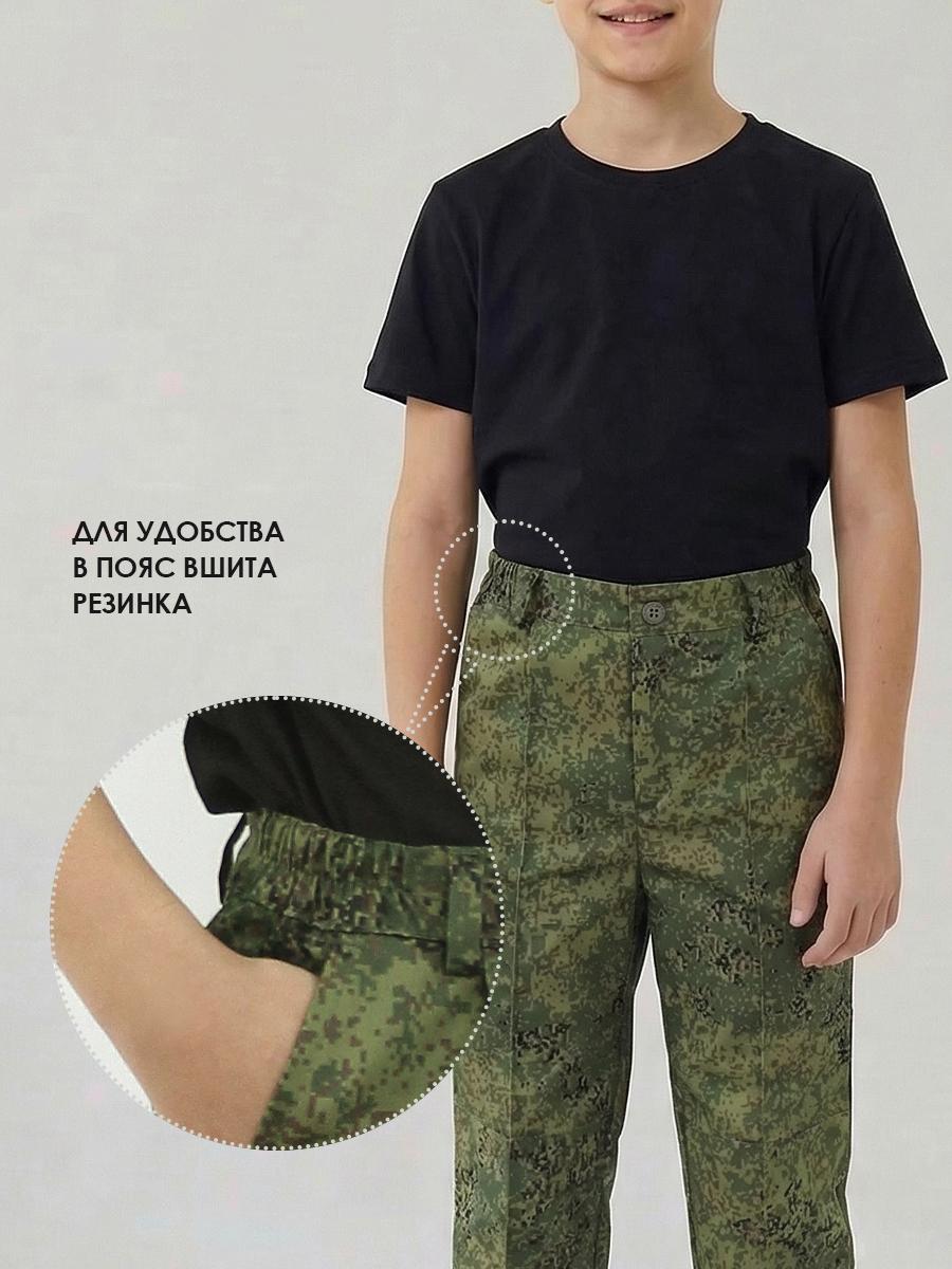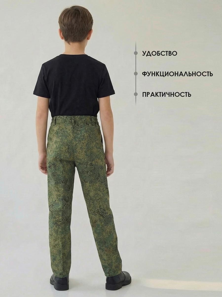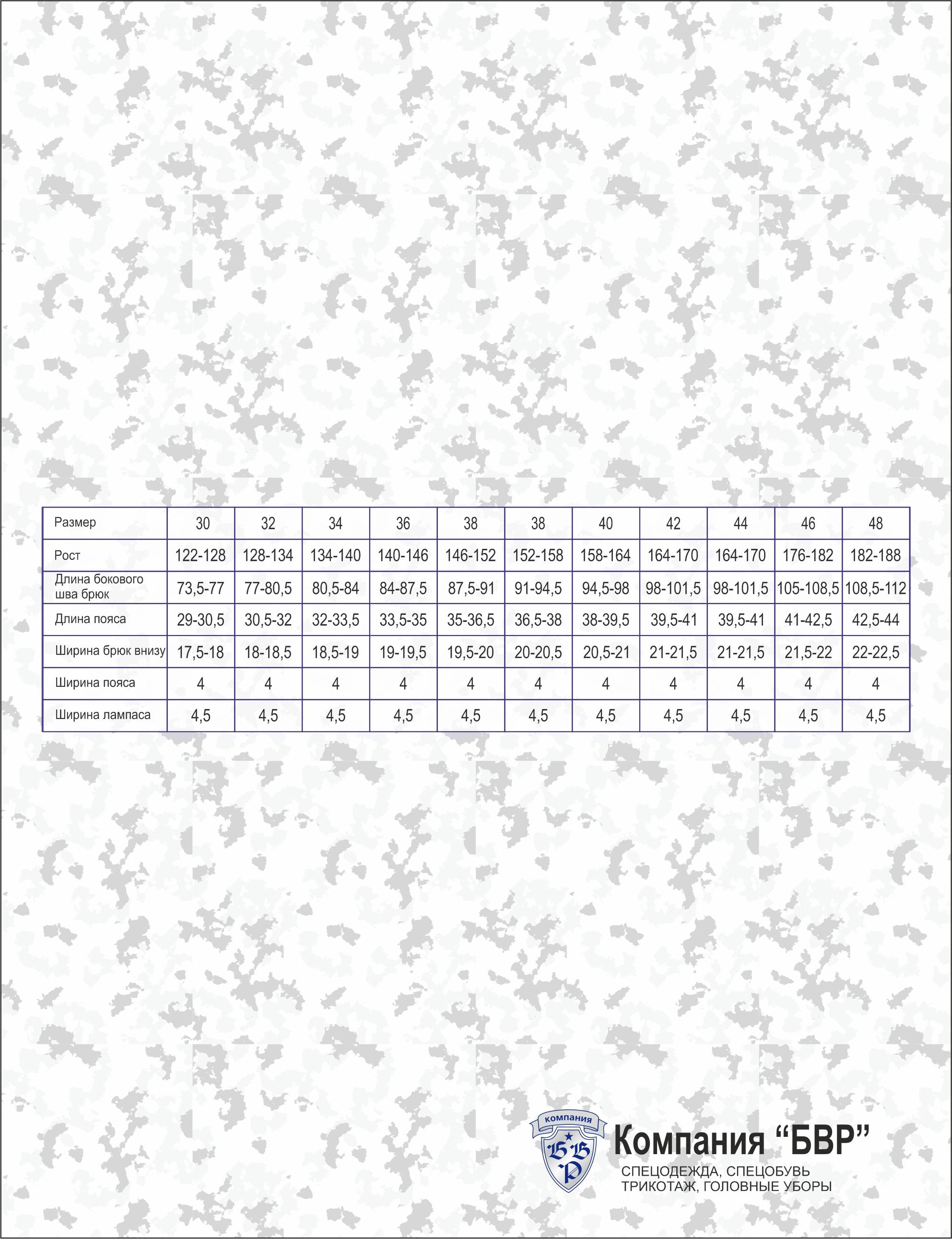 Брюки прямого покроя с притачным поясом, двумя хлястиками над боковыми швами, застегивающимися на пуговицу и пятью шлевками. Передние половинки брюк со складками. Задние половинки брюк с вытачками. Брюки застегиваются на пуговицу и тесьму - "молнию" на гульфе.