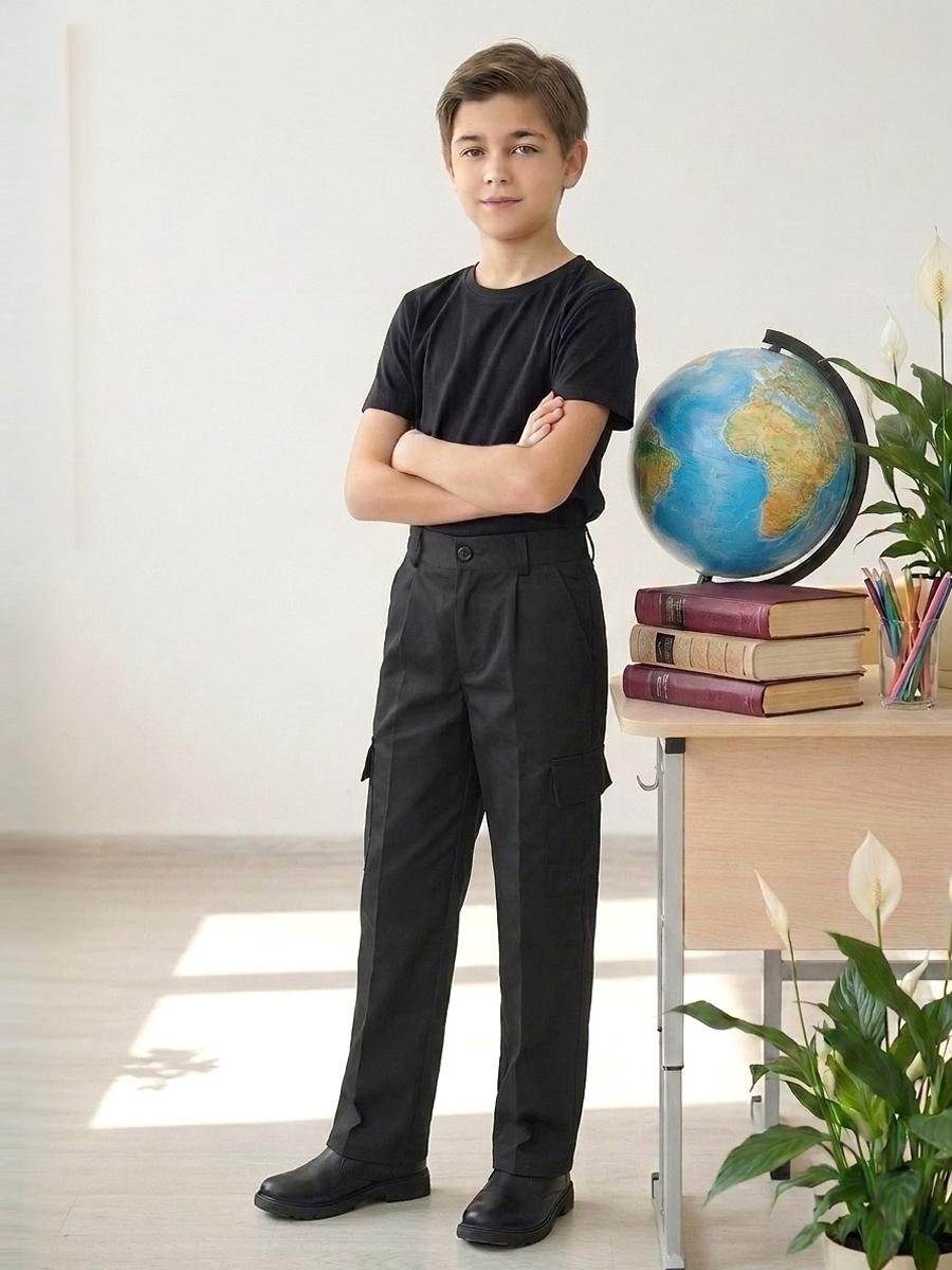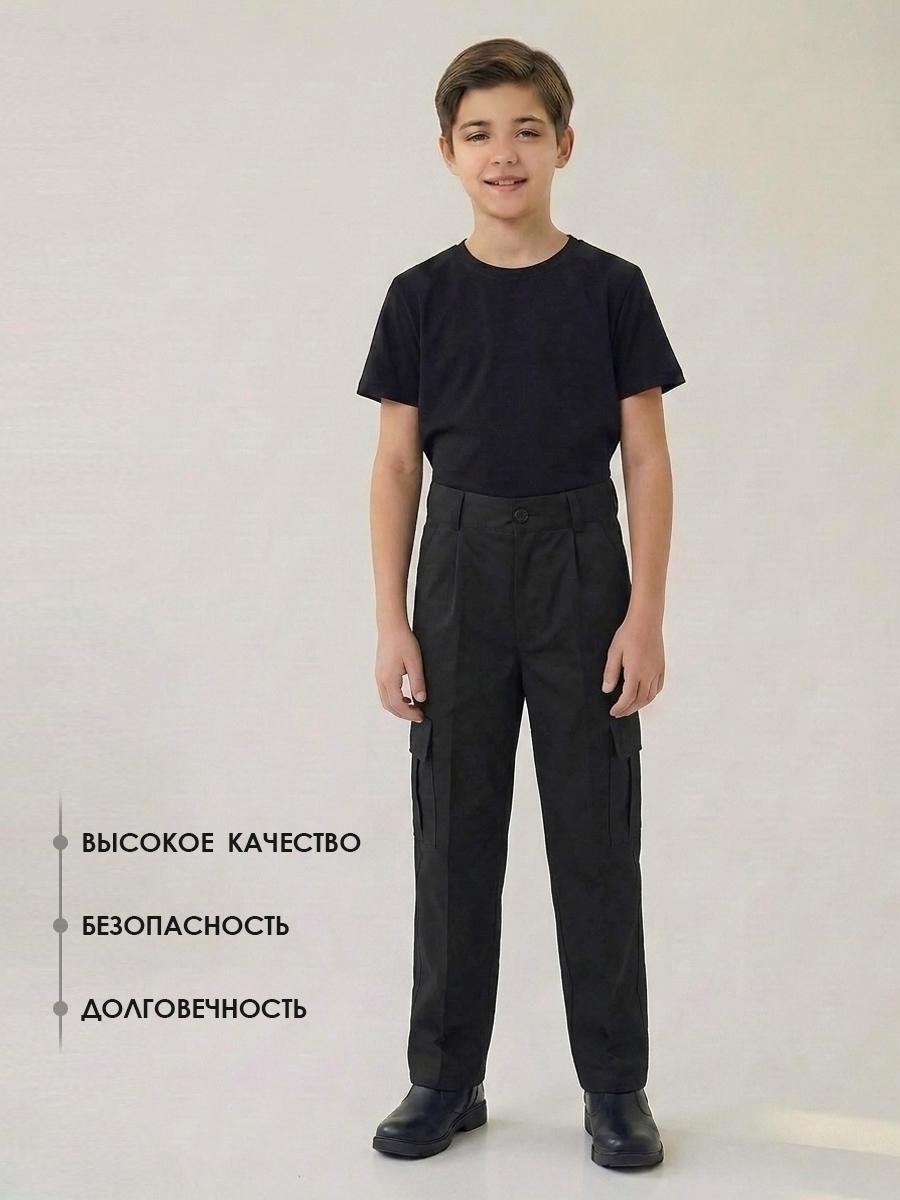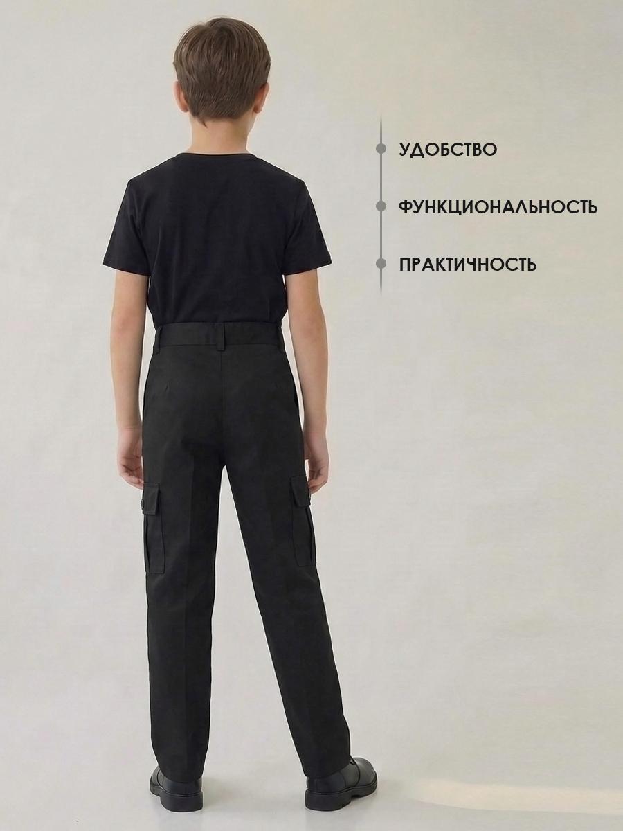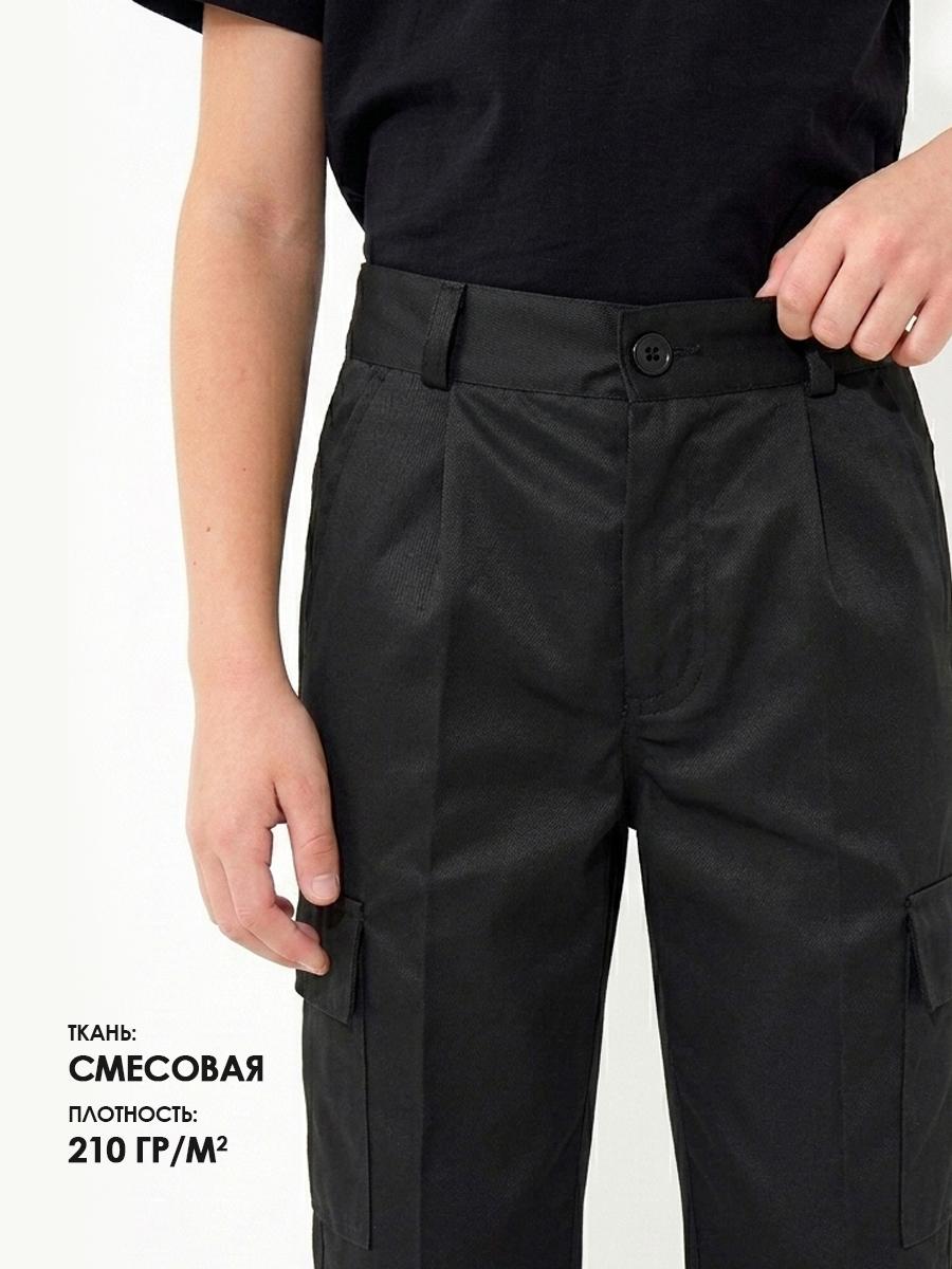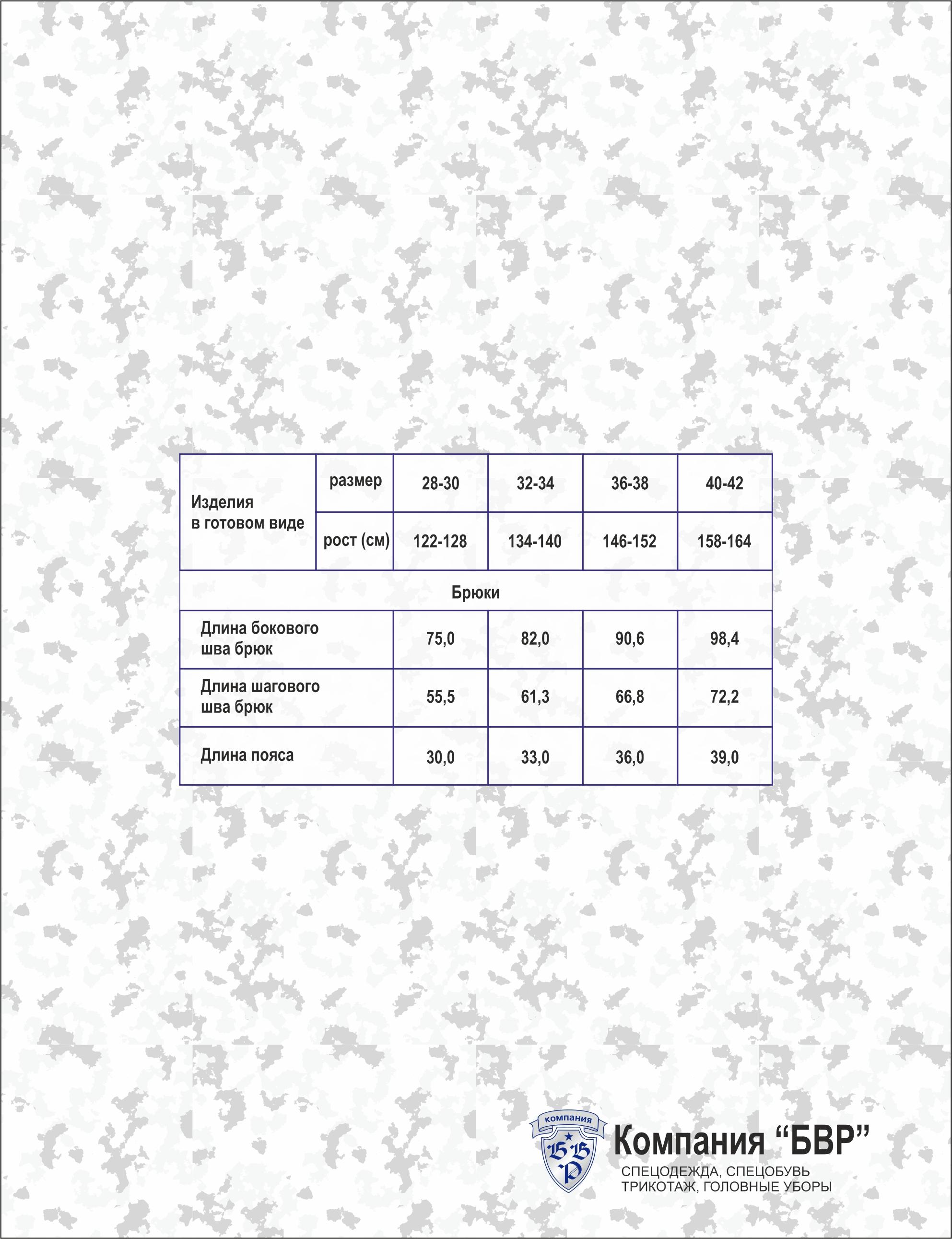 Брюки прямого покроя, с притачным поясом, двумя хлястиками над боковыми швами, застегивающимися на пуговицу и пятью шлевками. На брюках в зоне бедра имеются оюъёмные карманы с клапаном.. Передние половинки брюк со складками. Задние половинки брюк с вытачками. Брюки застегиваются на пуговицу и тесьму - "молнию" на гульфе. ГОСТ 25295-2003