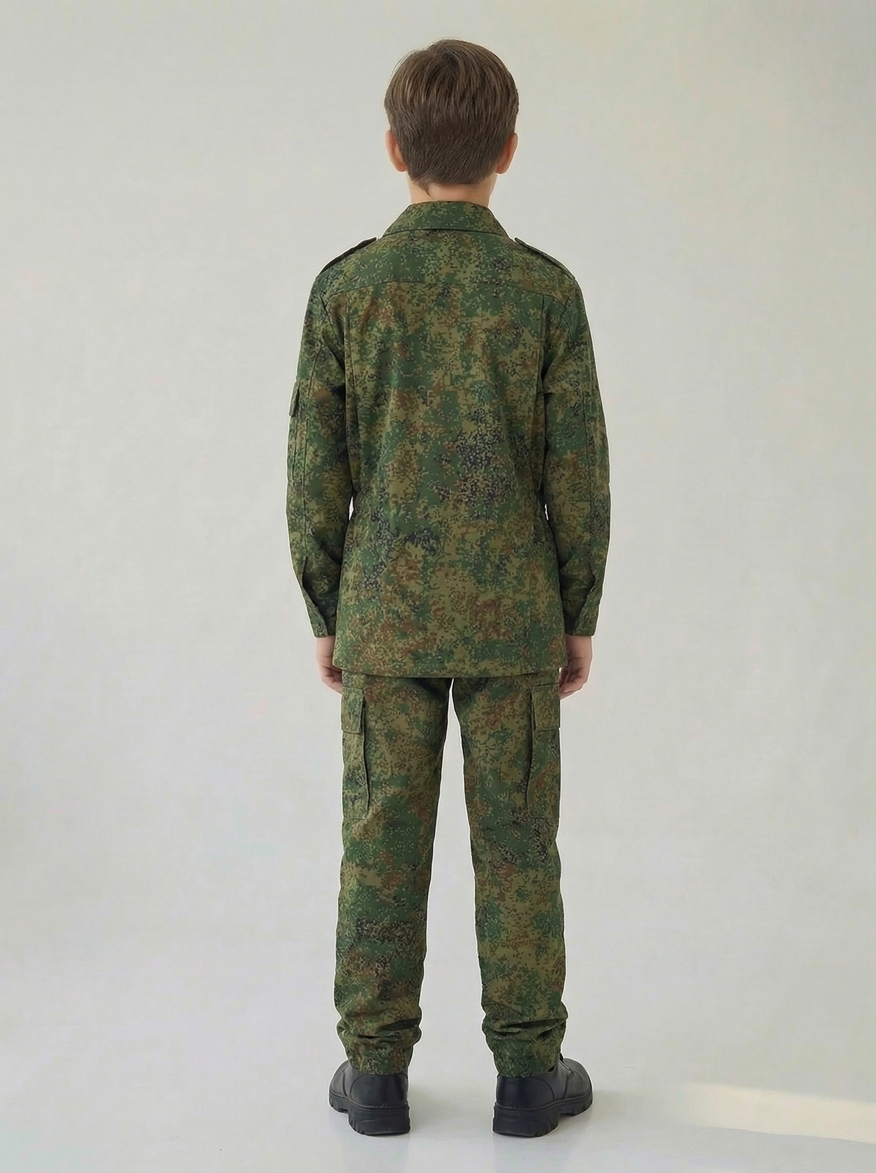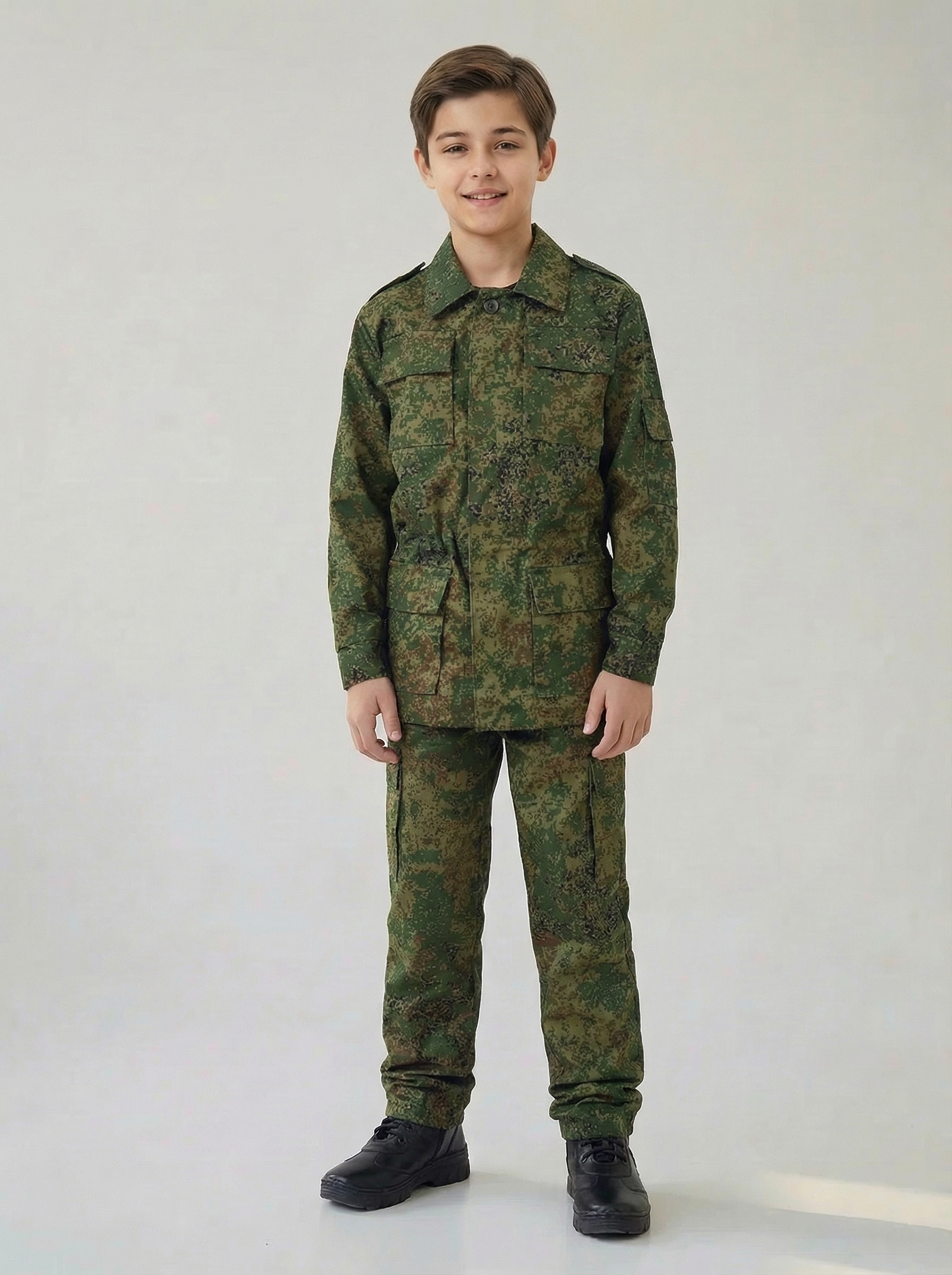 Костюм состоит из куртки и брюк. Куртка с центральной потайной застежкой на петли и пуговицы, по линии талии стянута эластичной тесьмой, с объемными накладными карманами с клапанами, спинка на кокетке, рукав втачной на манжете с накладными карманами. Брюки на притачном поясе со шлевками и застежкой на петли и пуговицы, накладными карманами с клапанами и карманами с отрезным бочком. Рекомендуемые материалы: х/б и хлопкополиэфирные ткани. ГОСТ 25295-2003