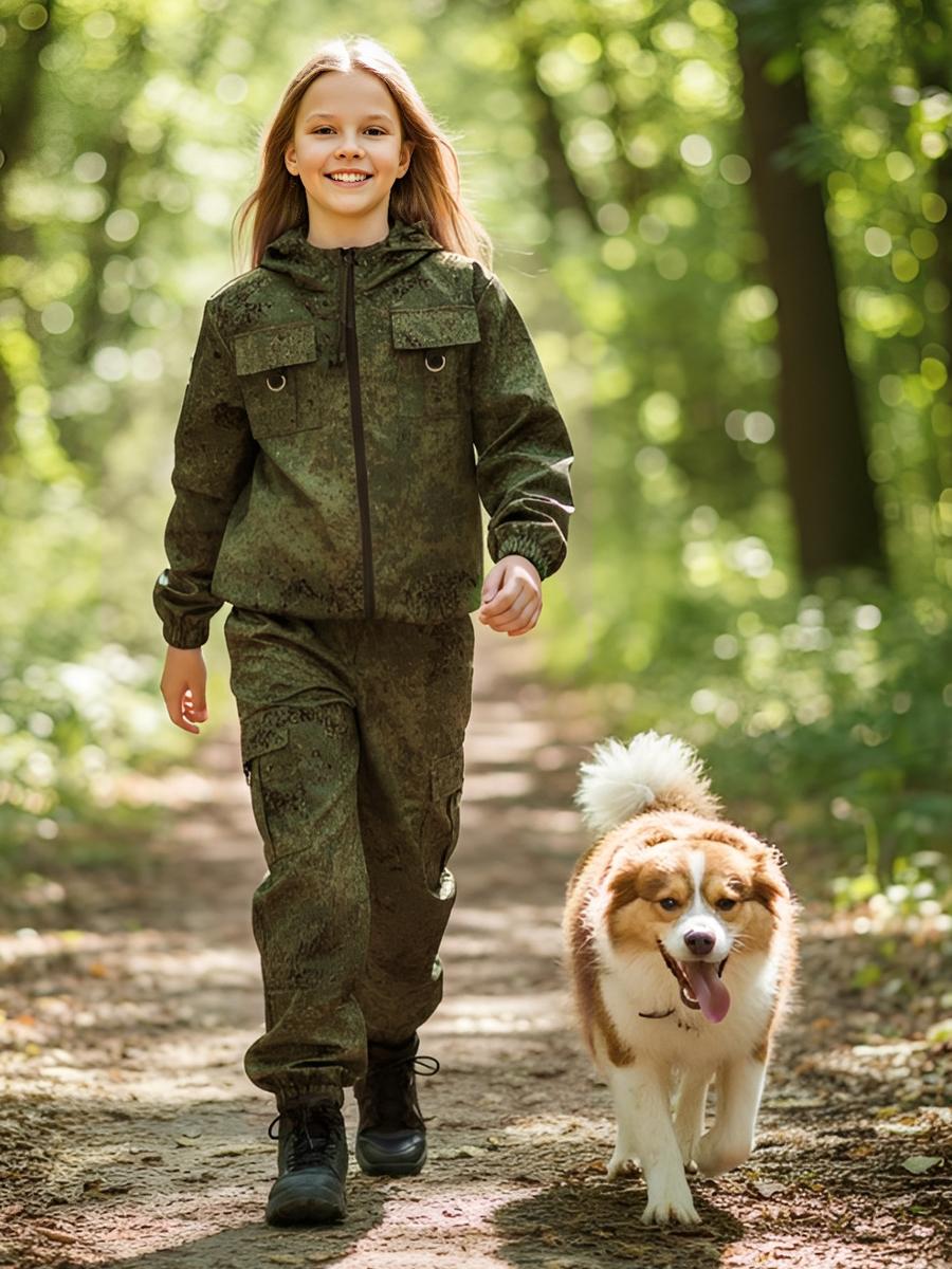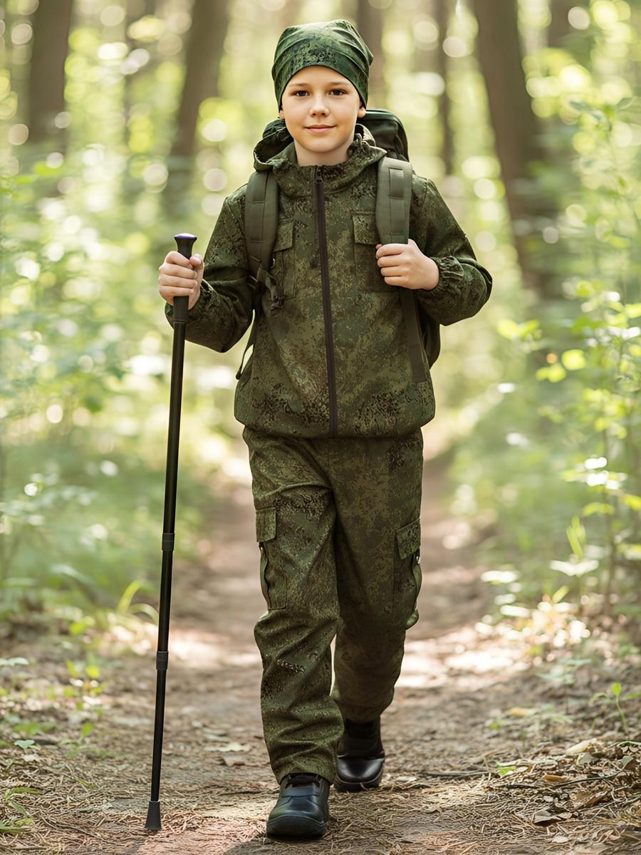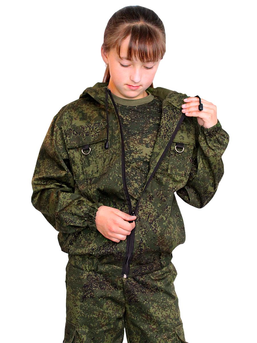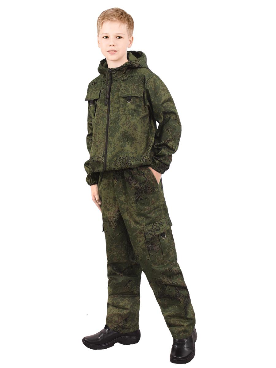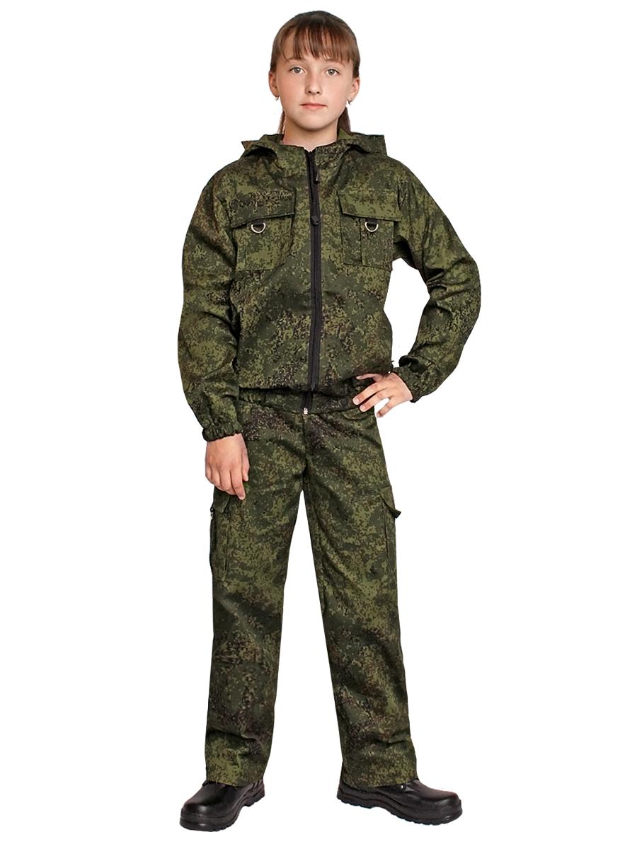 Костюм состоит из куртки и брюк. Куртка укороченная с капюшоном, центральной застежкой на тесьму-молнию, с накладными карманами с клапанами и декорацией из полукольца, рукав втачной по низу стянут эластичной тесьмой. Низ куртки стянут на эластичную тесьму. Брюки прямые на поясе стянуты эластичной тесьмой, карманами с отрезным бочком и боковыми карманами с клапаном. Рекомендуемые материалы: смесовые ткани. ГОСТ 25295-2003