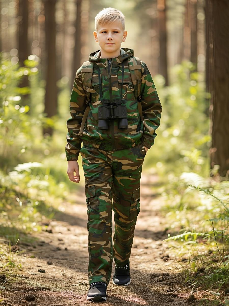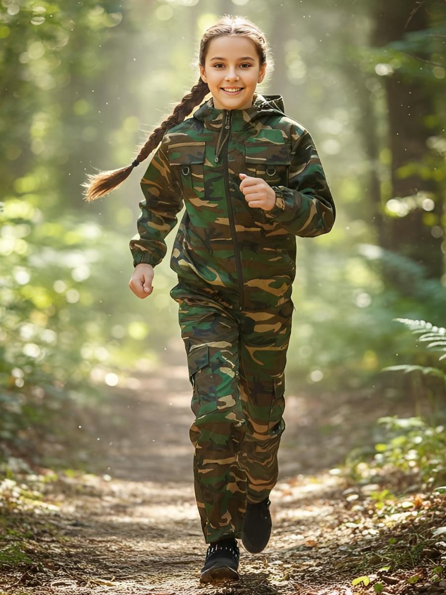 Костюм состоит из куртки и брюк. Куртка укороченная с капюшоном, центральной застежкой на тесьму-молнию, с накладными карманами с клапанами и декорацией из полукольца, рукав втачной по низу стянут эластичной тесьмой. Низ куртки стянут на эластичную тесьму. Брюки прямые на поясе стянуты эластичной тесьмой, карманами с отрезным бочком и боковыми карманами с клапаном. Рекомендуемые материалы: смесовые ткани.