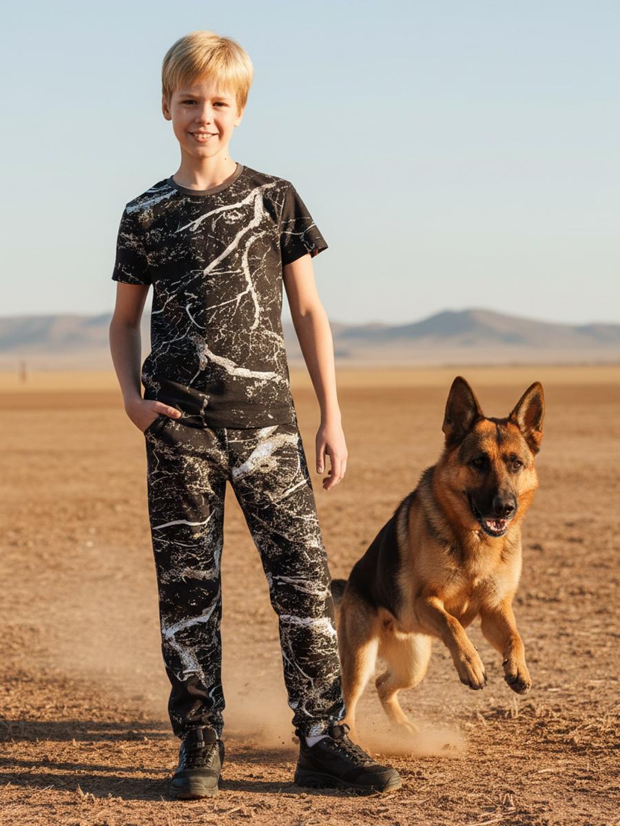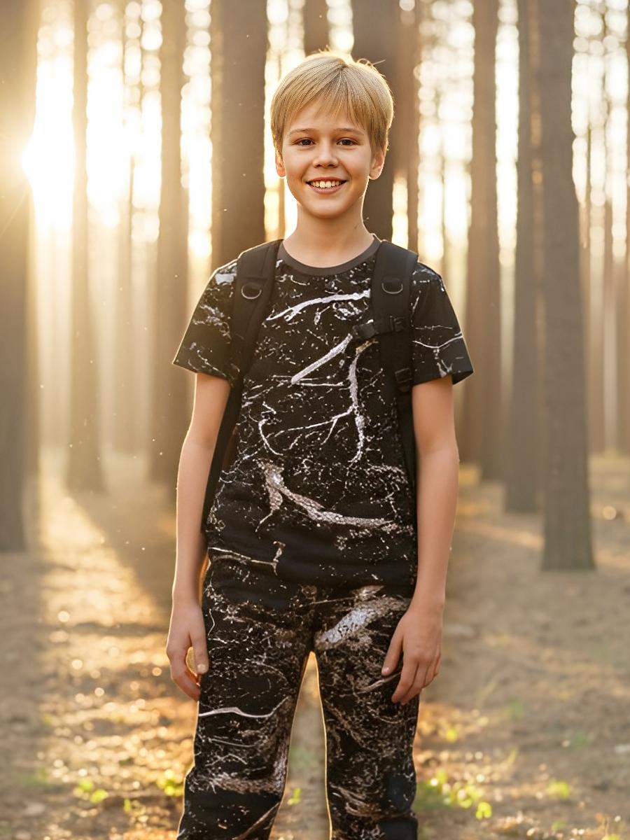 Костюм детский трикотажный состоит из футболки и брюк. Классическая модель футболки, прямой покрой. Горловина обработана рибаной. Брюки прямые на поясе стянуты эластичной резинкой. В боковых швах карманы. По низу изделия предусмотрены эластичные манжеты. Удобная и практичная модель для туристического отдыха и прогулок.