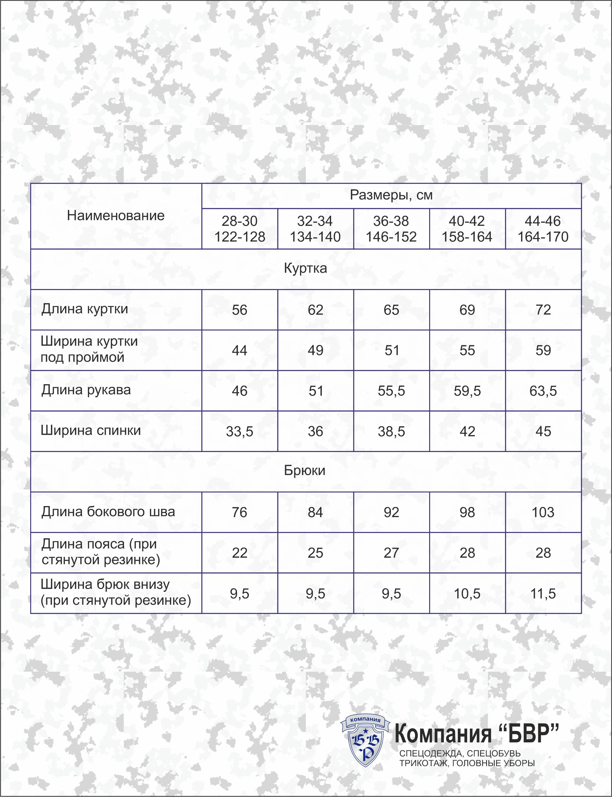 | Ширина куртки под проймой (ширина борта 3 см) | 43,0 | 47,0 | 51,0 | 55,0 | 59,0 | +-1 | |