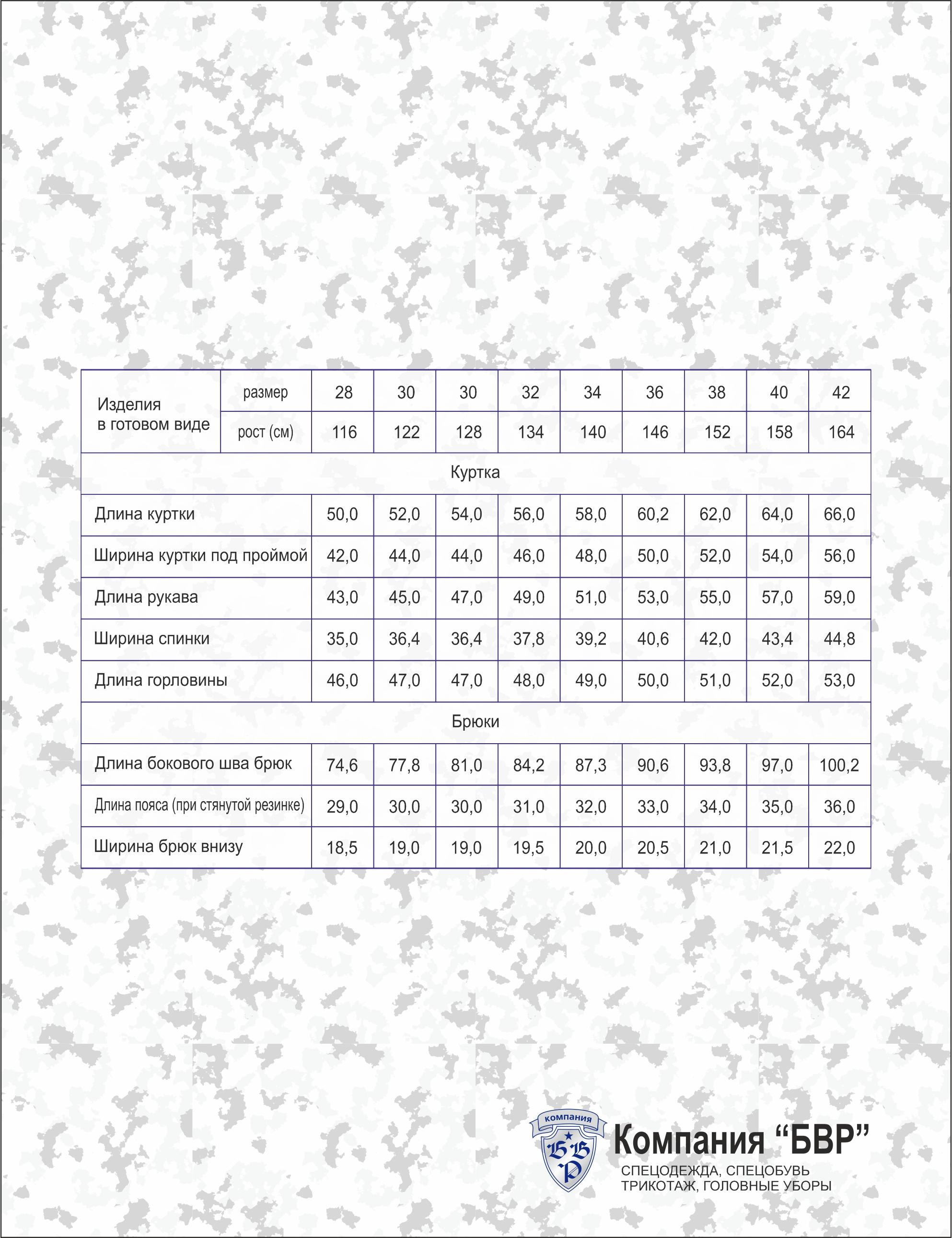 | Ширина куртки под проймой (ширина борта 3 см) | 43,0 | 47,0 | 51,0 | 55,0 | 59,0 | +-1 | |