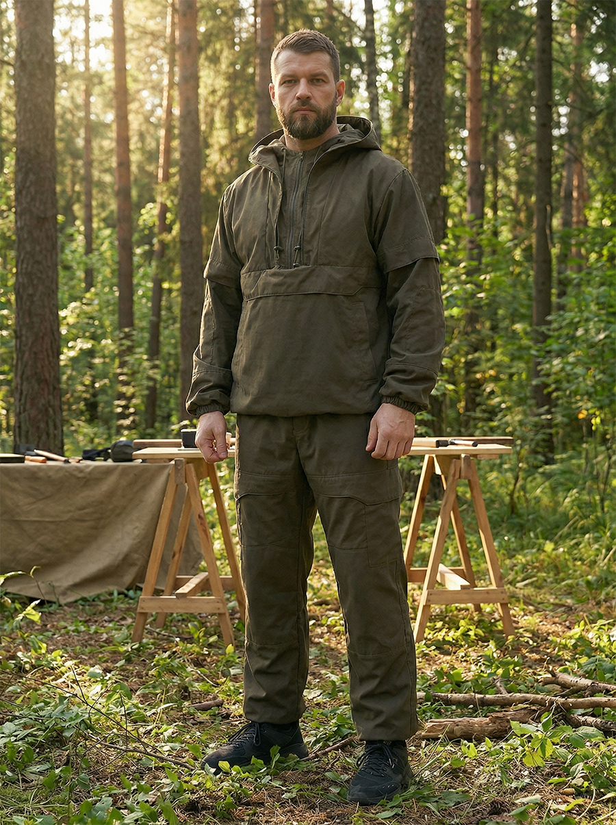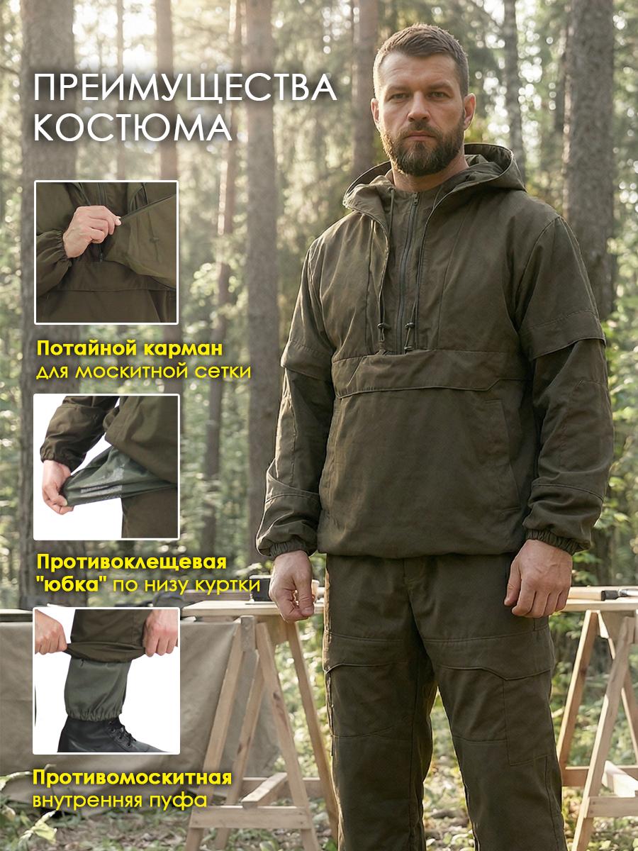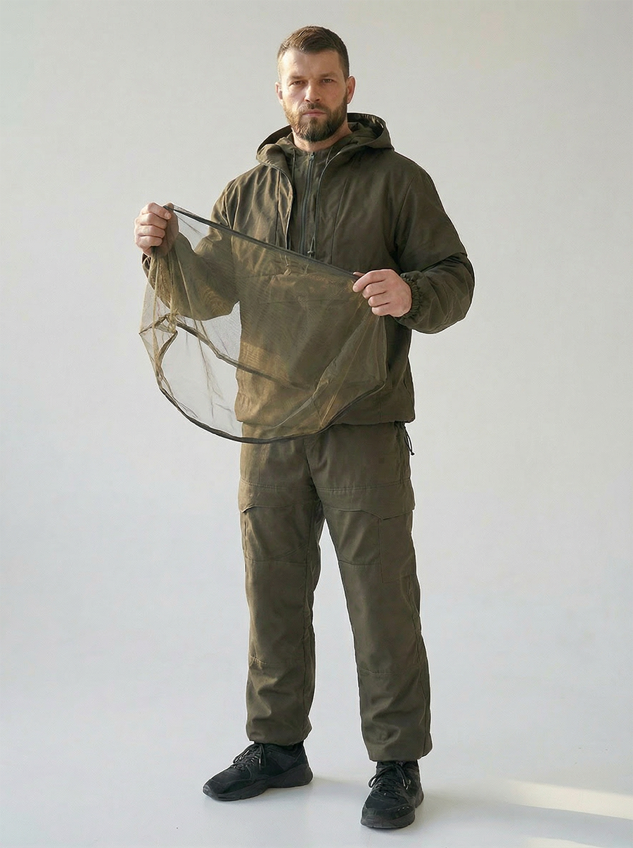 Костюм «Элит-Барьер» разработан на основе классического противоэнцефалитного костюма, который состоит из куртки типа с капюшоном и брюк прямого кроя. Костюм оснащен специальными ловушками для клещей, внутри куртки предусмотрен дополнительный слой хлопковой ткани, которая заправляется в брюки для максимальной защиты от проникновения внутрь изделия. Рукава оснащены плотными трикотажными манжетами. На капюшоне предусмотрена молния для противомоскитной сетки, которая компактно укладывается в карман на груди. В передней части куртки предусмотрен объемный передний влагозащитный карман и два боковых. Этот костюм отлично подойдет для всех, кто часто и долго бывает в лесу. Для обеспечения безопасности в темное время суток вся печать на изделии является светоотражающей.