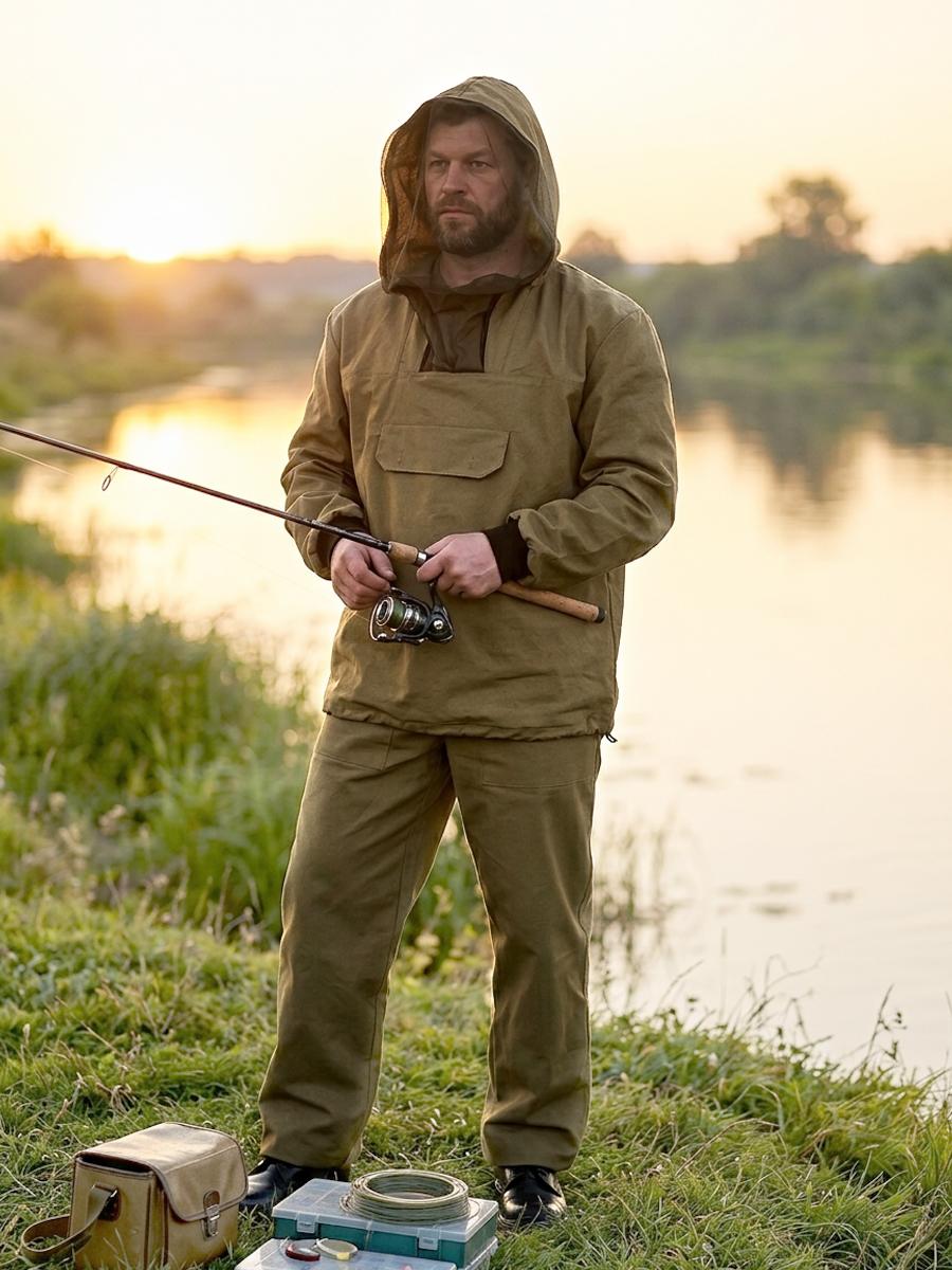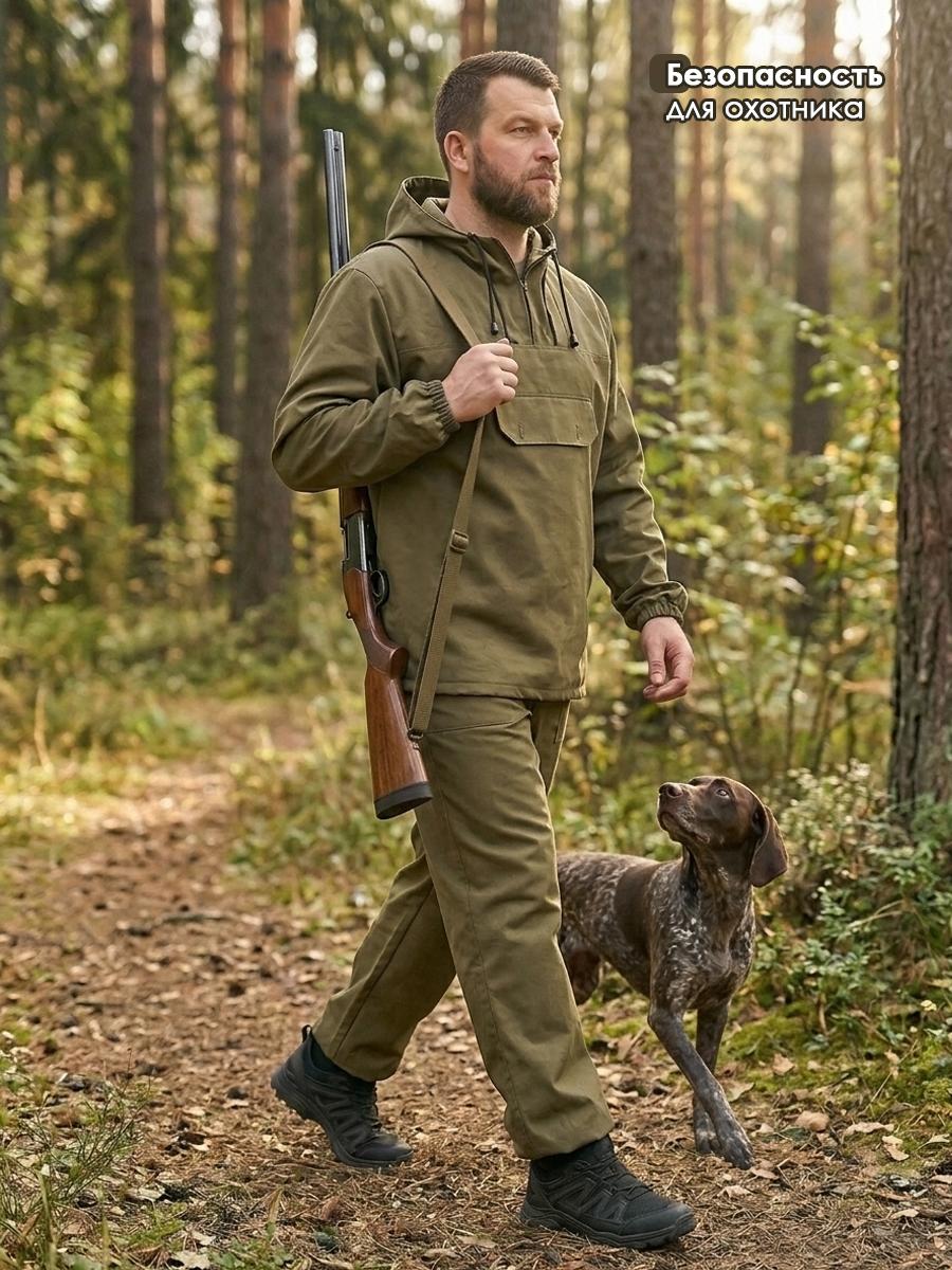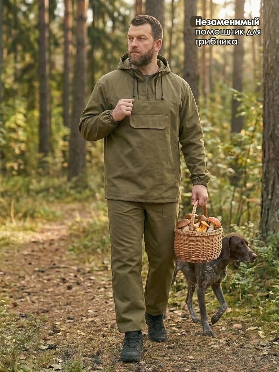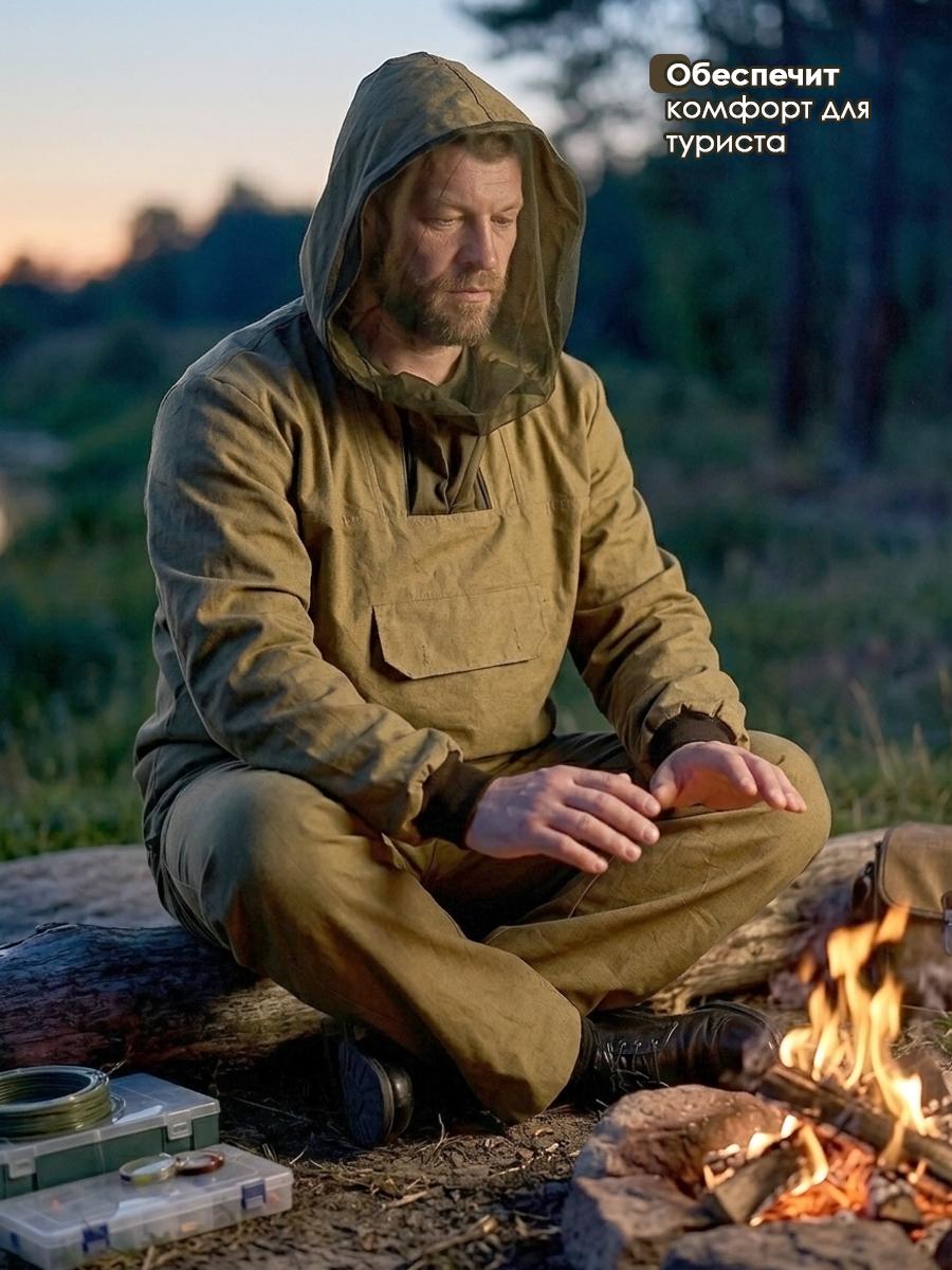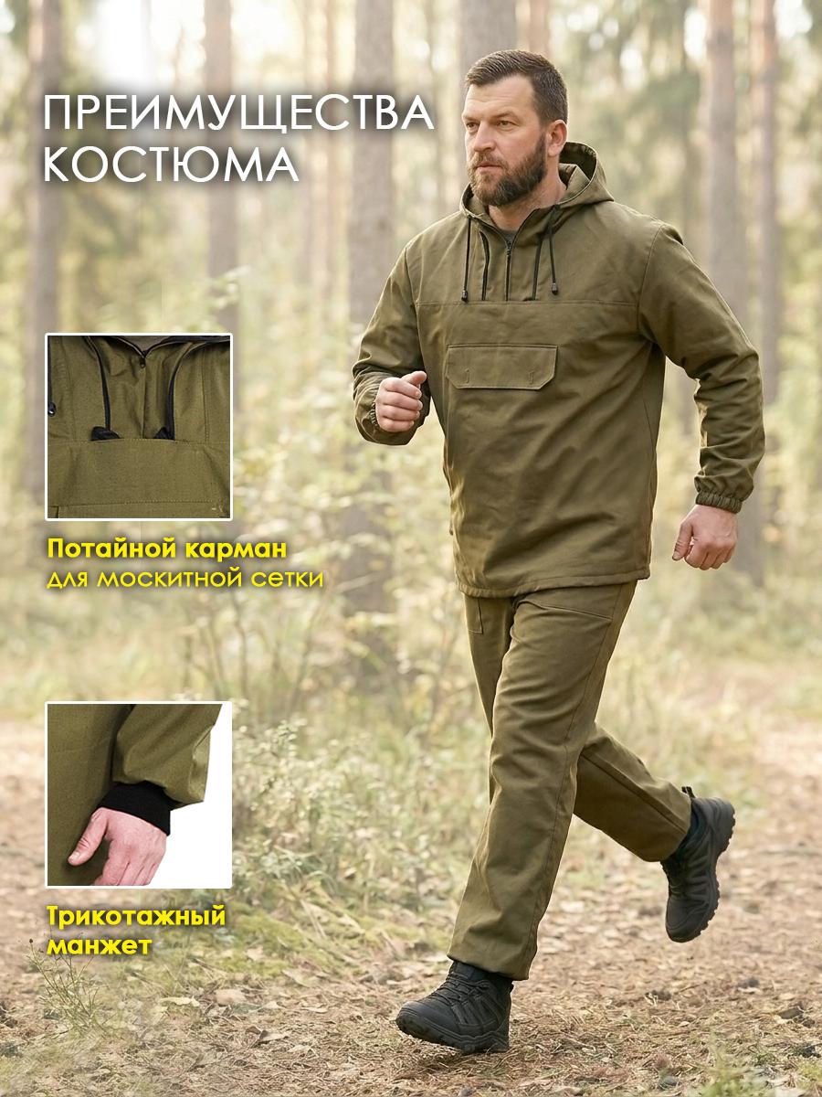 Костюм противоэнцефалитный состоит из куртки и брюк. Куртка с капюшоном, оснащена противомоскитной сеткой на молнии, убирающейся в специальный потайной карман, с прорезным карманом на груди, застёгивающимся на тесьму-молнию, с прикрывающим клапаном, рукав втачной, длинный, с трикотажным манжетом. Брюки прямые, на поясе со шлёвками, стянутом эластичной тесьмой, по бокам карманы с отрезным бочком и накладными карманами на передней части бедра, по низу ширина брюк регулируется эластичным тесьмой. Рекомендуемые материалы: смесовые ткани, палаточные ткани.