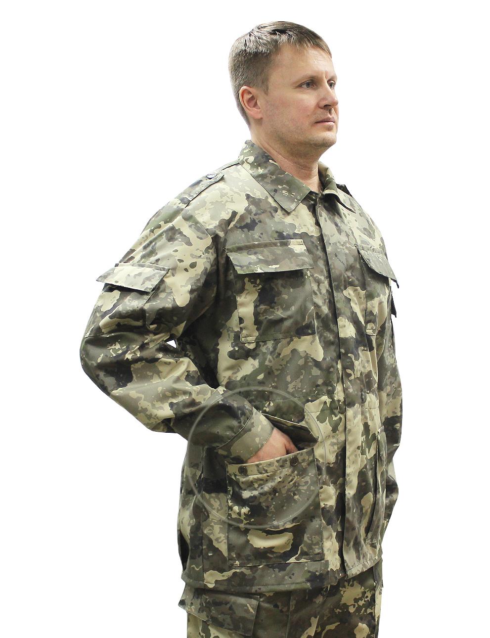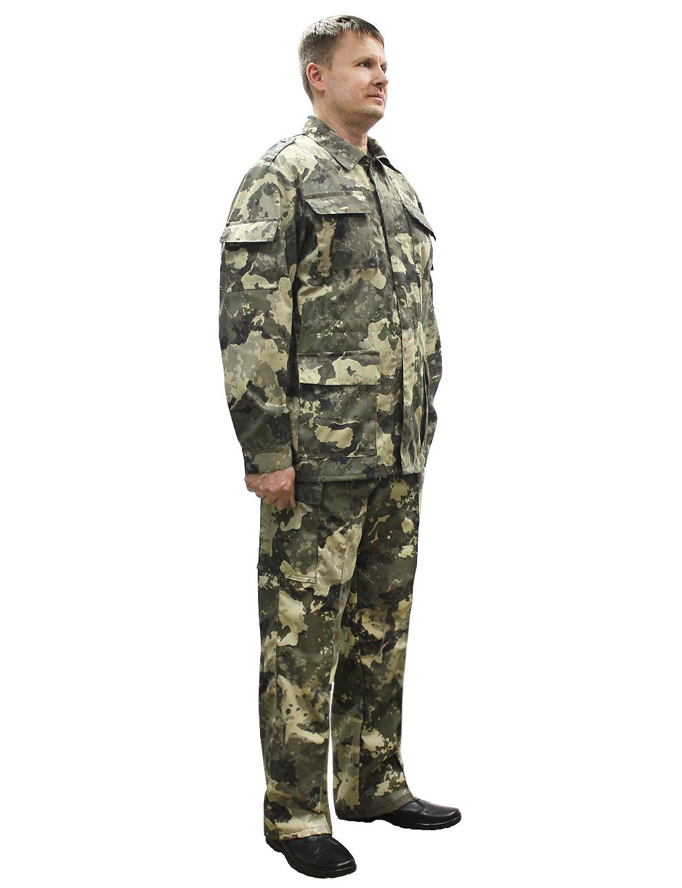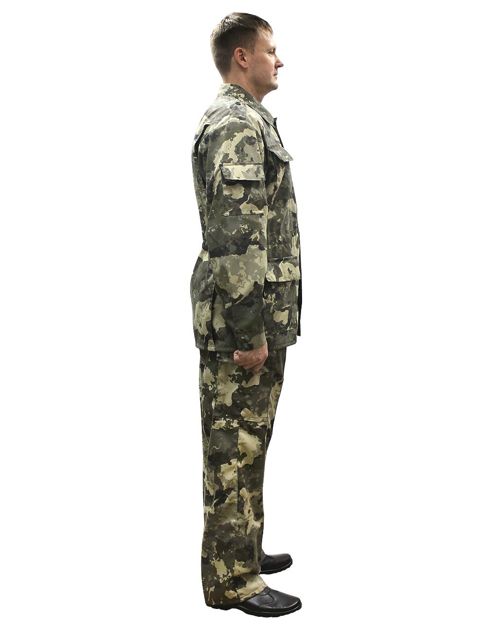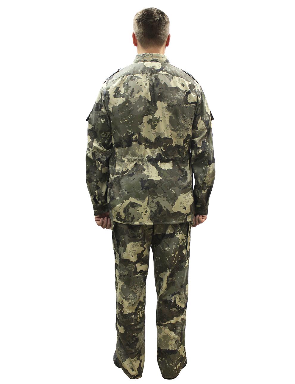 Костюм военно-полевой состоит из куртки и брюк. Куртка с центральной потайной застежкой на петли и пуговицы, по линии талии стянута эластичной тесьмой, с четырьмя объемными накладными карманами с клапанами, рукав втачной на манжете с накладными карманами. Брюки на притачном поясе с широкими шлевками и застежкой на петли и пуговицы, двумя карманами с отрезным бочком, по боковым швам в зоне бедра расположен накладной объёмный карман с клапаном.Рекомендуемые материалы: ткань Грета камуфлированная