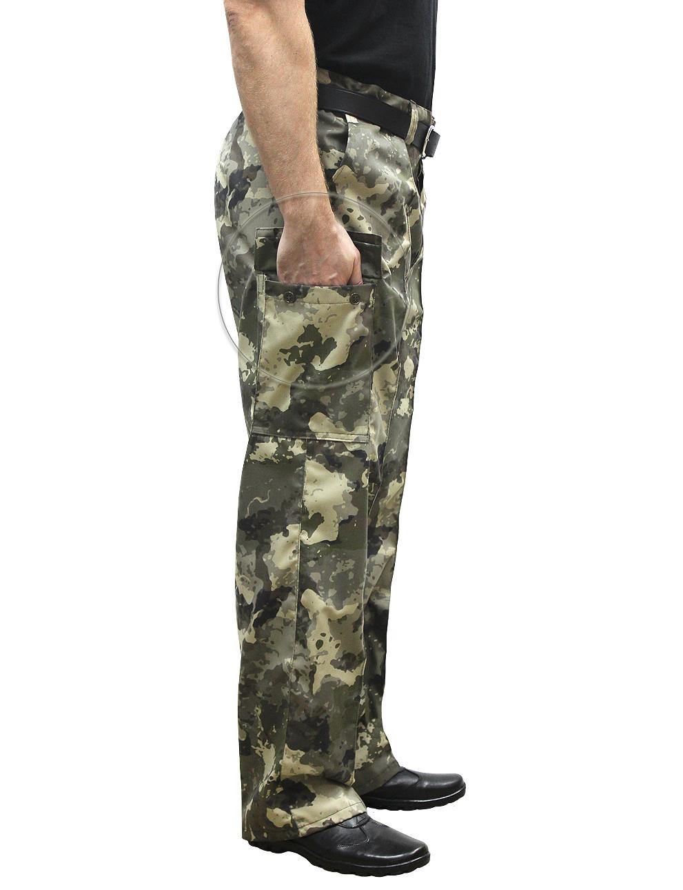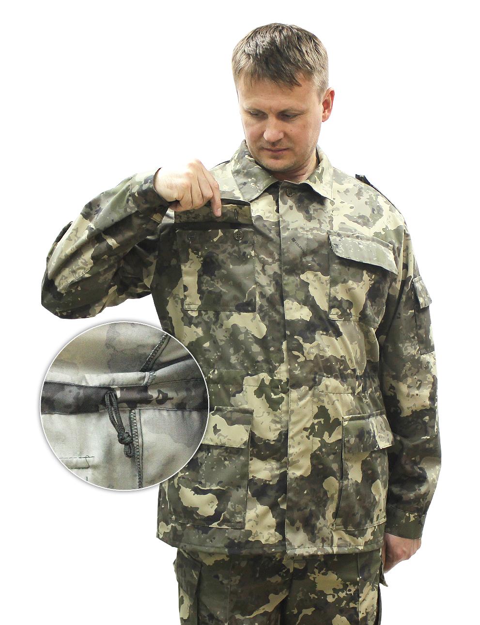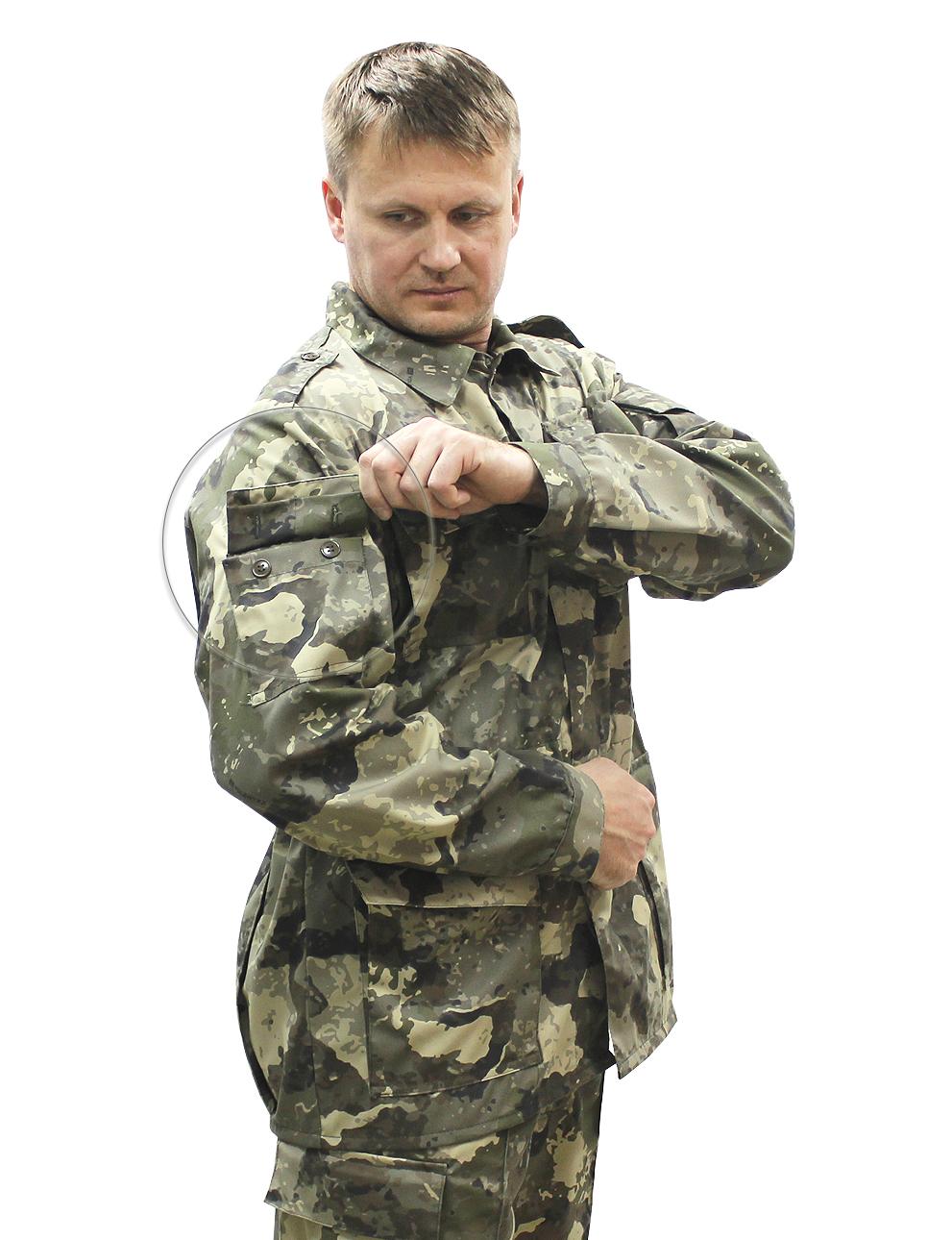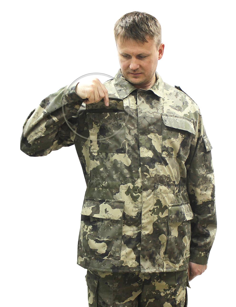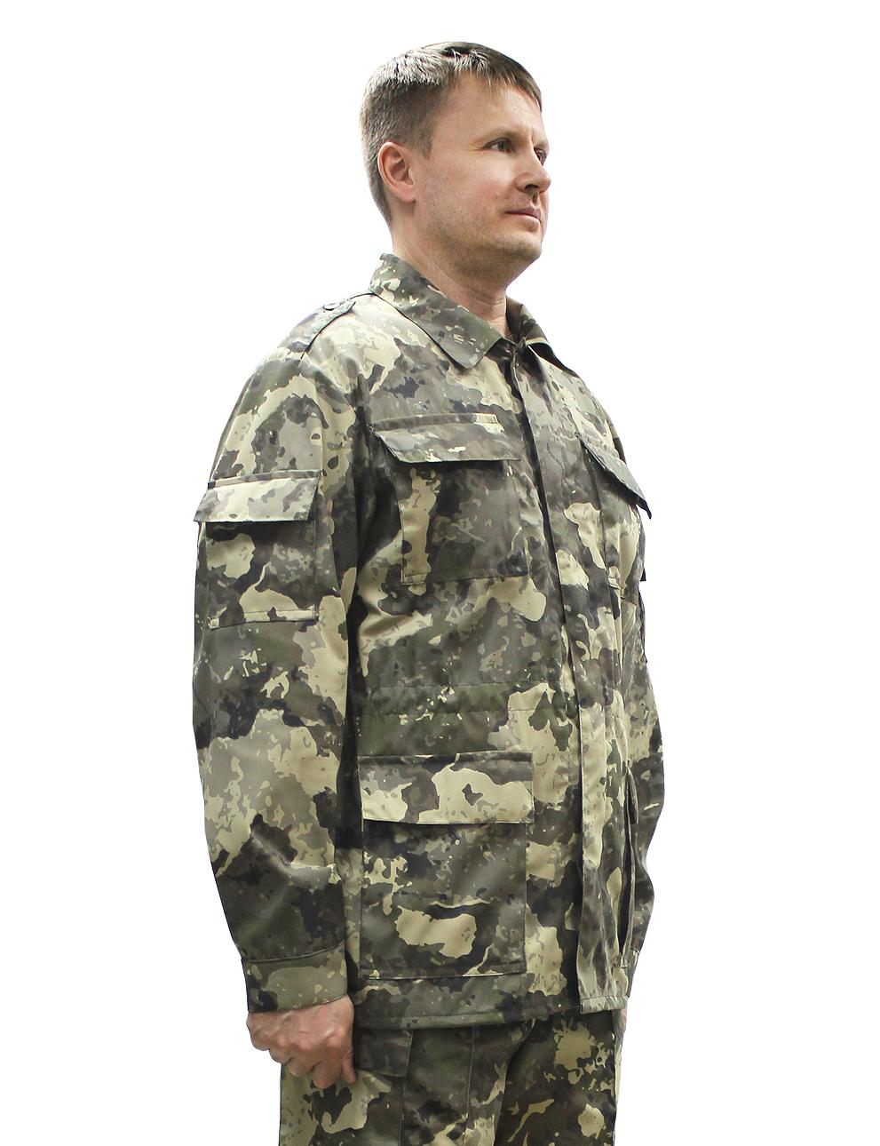 Костюм военно-полевой состоит из куртки и брюк. Куртка с центральной потайной застежкой на петли и пуговицы, по линии талии стянута эластичной тесьмой, с четырьмя объемными накладными карманами с клапанами, рукав втачной на манжете с накладными карманами. Брюки на притачном поясе с широкими шлевками и застежкой на петли и пуговицы, двумя карманами с отрезным бочком, по боковым швам в зоне бедра расположен накладной объёмный карман с клапаном.Рекомендуемые материалы: ткань Грета камуфлированная