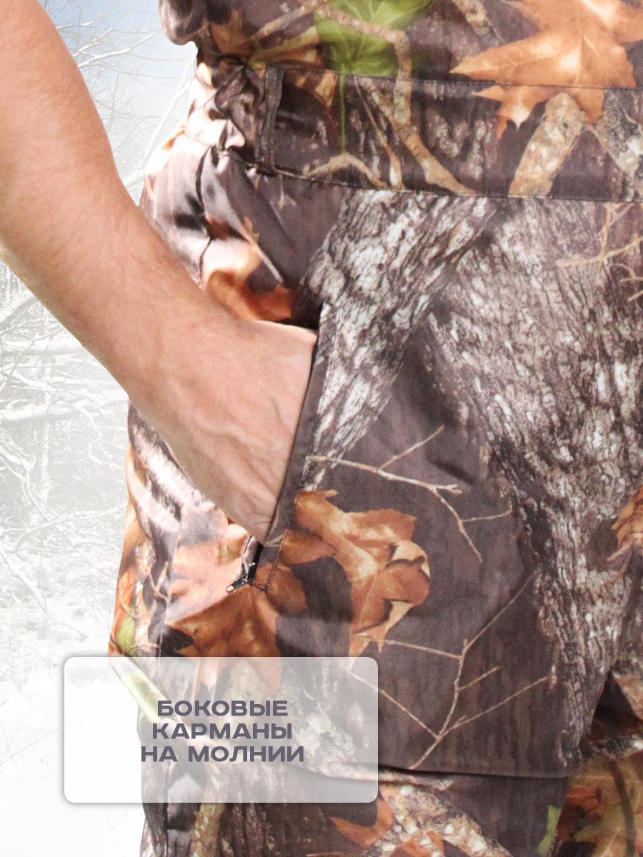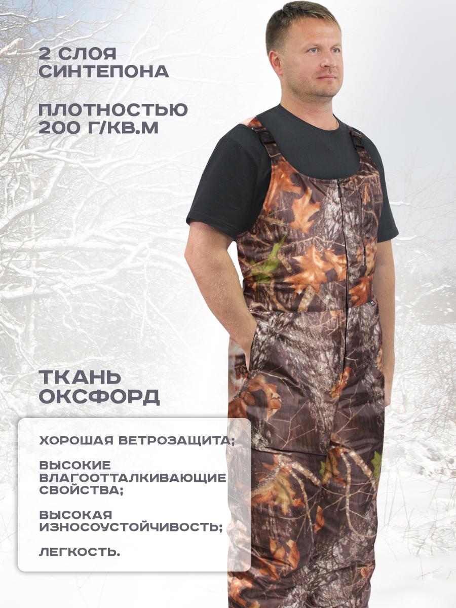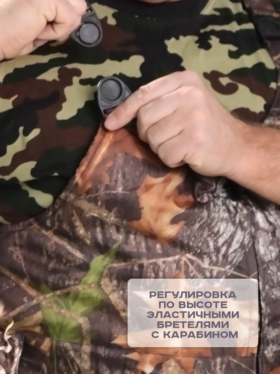 Полукомбинезон утеплённый облегченный, расцветки "Лес" с центральной бортовой застежкой на тесьму-молнию, прорезным карманом на молнии и боковыми карманами с отрезным бочком. По линии талии стянут эластичной тесьмой. Имеются бретели с карабинами для подгонки по росту. Полукомбинезон из ткани Оксфорд, утеплен двумя слоями синтепона. Рекомендуемые материалы: Смесовые ткани и плащевые ткани с пропиткой ВО. ГОСТ 25295-2003