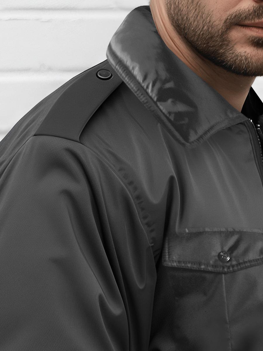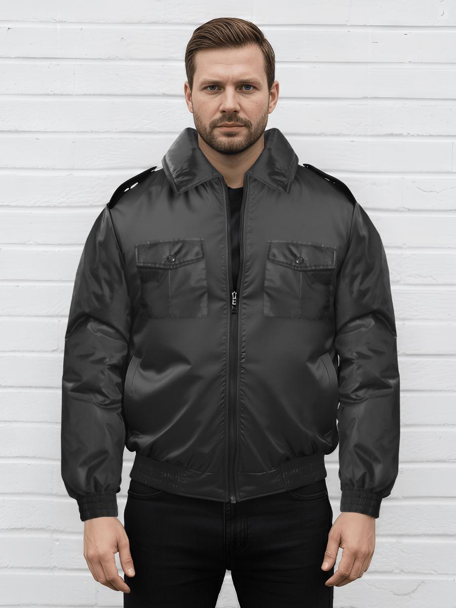 Ветровка Охрана благодаря особенностям пошива и использованию современных материалов с водоотталкивающей пропиткой надежно защищает от ветра и влаги, а одинарный слой синтепона обеспечивает дополнительную теплоту. Это комфортный и функциональный вариант экипировки как для сотрудников при обеспечении безопасности вне помещений, так и для любителей активного отдыха на природе. Куртка с втачным рукавом и отложным воротником застегивается по центру на молнию, накладные карманы на груди с клапанами на кнопках имеют встречную складку, фактически увеличивающую их объем. На уровне талии прорезные карманы. На плечах куртки погоны, на которые можно закрепить фальшпогоны. Манжеты и низ куртки регулируются по объему эластичной резинкой. Соответствует ГОСТ 25295-2003.