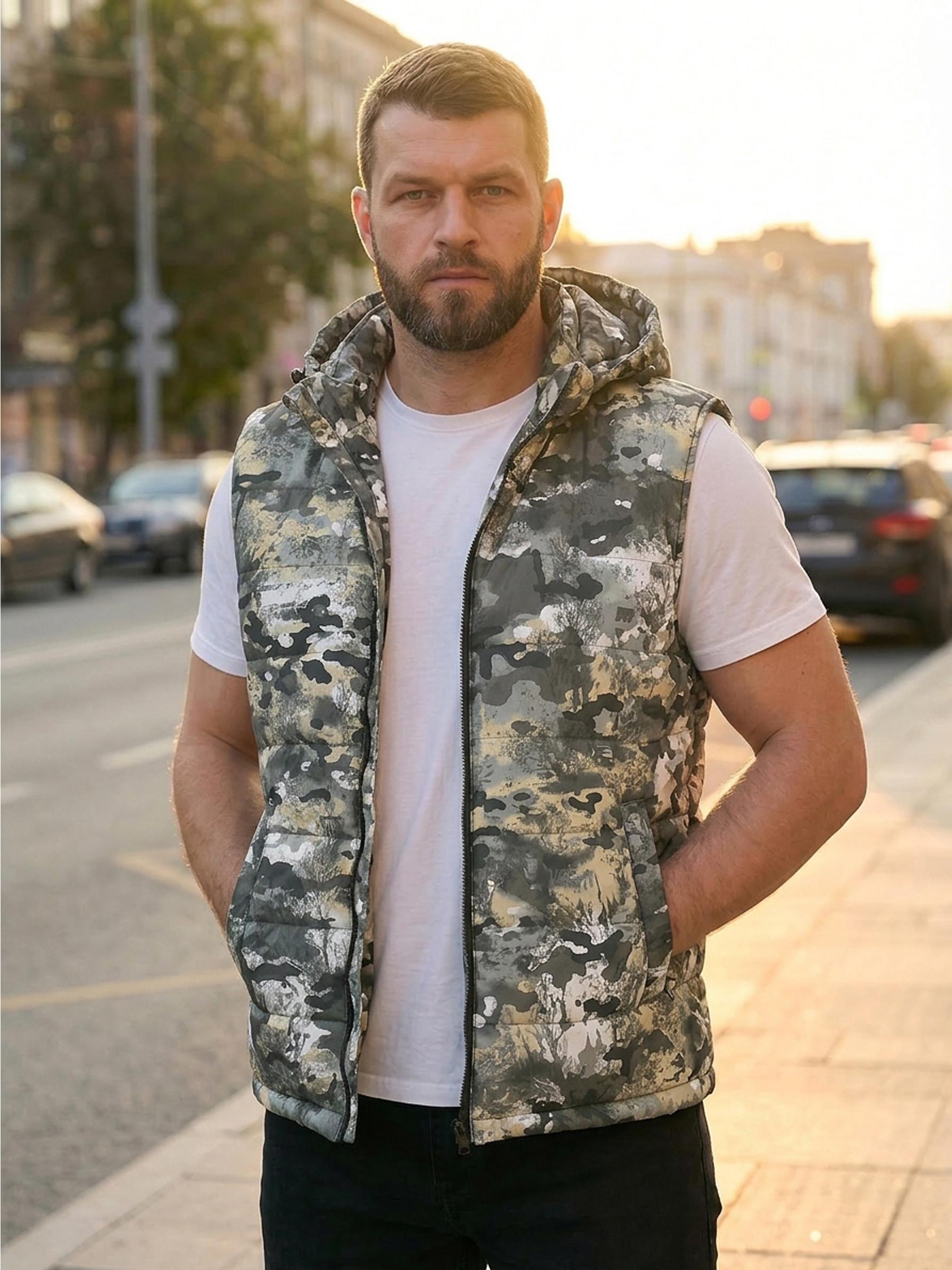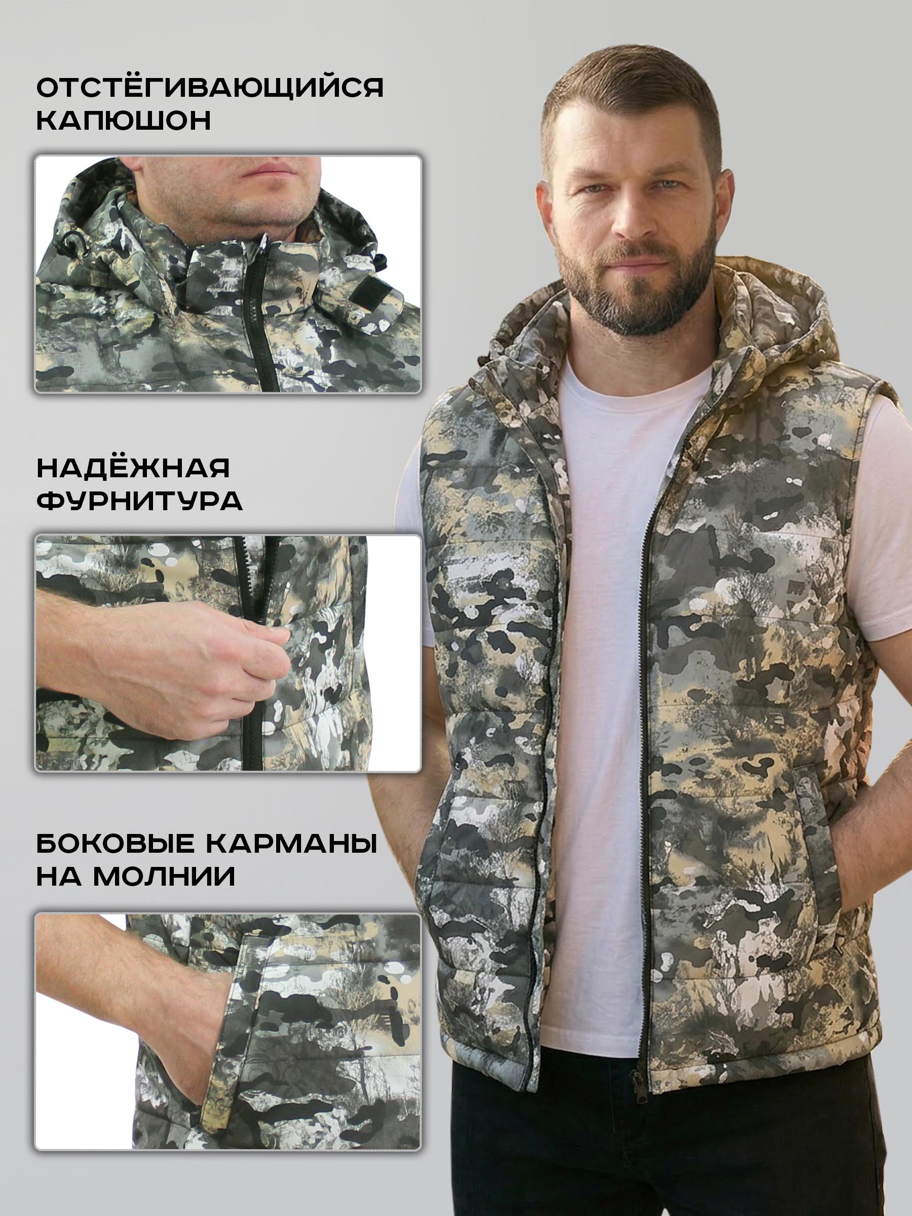 Жилет утепленный стеганный с воротником-стойкой и капюшоном. С внутренней стороны отделка - бязь. Застегивается на тракторную молнию. Имеются два наружных боковых кармана на молнии. Производится из ткани Дюспа.