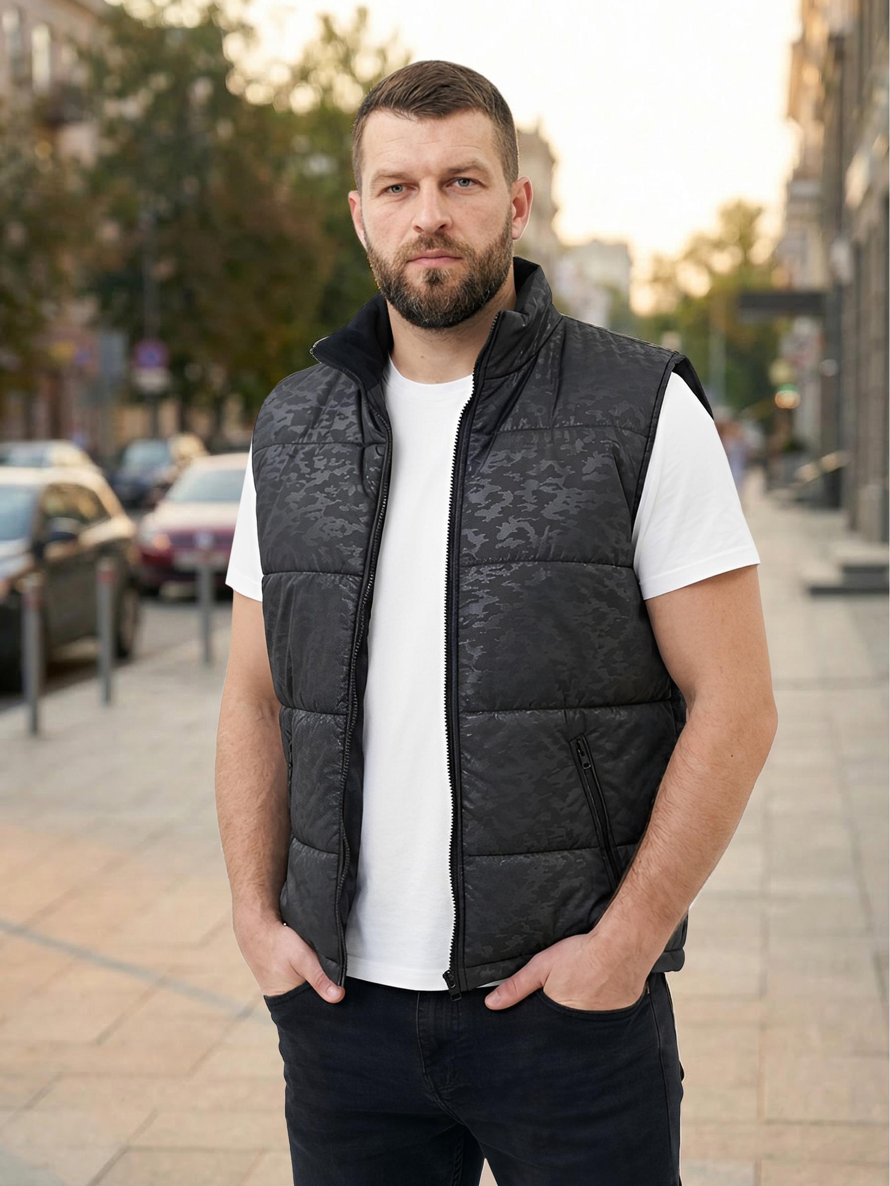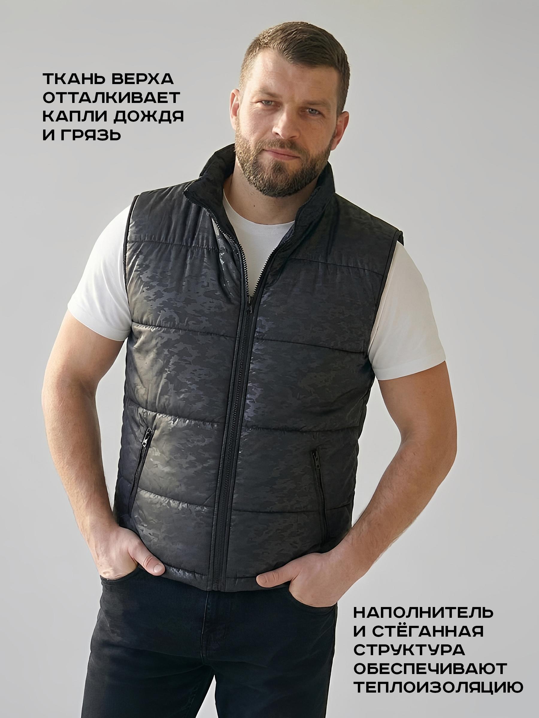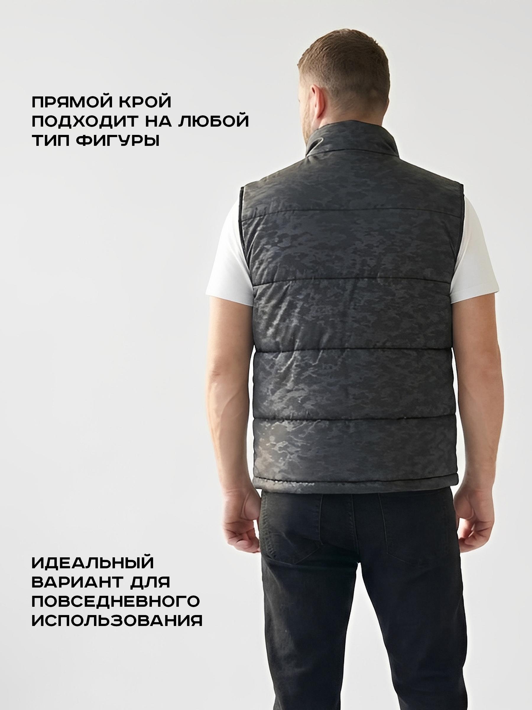 Жилет утепленный с воротником-стойкой. Обшит флисом с внутренней стороны.Застегивается на тракторную молнию. Имеется один внутренний карман и два наружных боковых кармана на молнии. Внизу жилета проходит утягивающая резинка с фиксаторами по бокам.