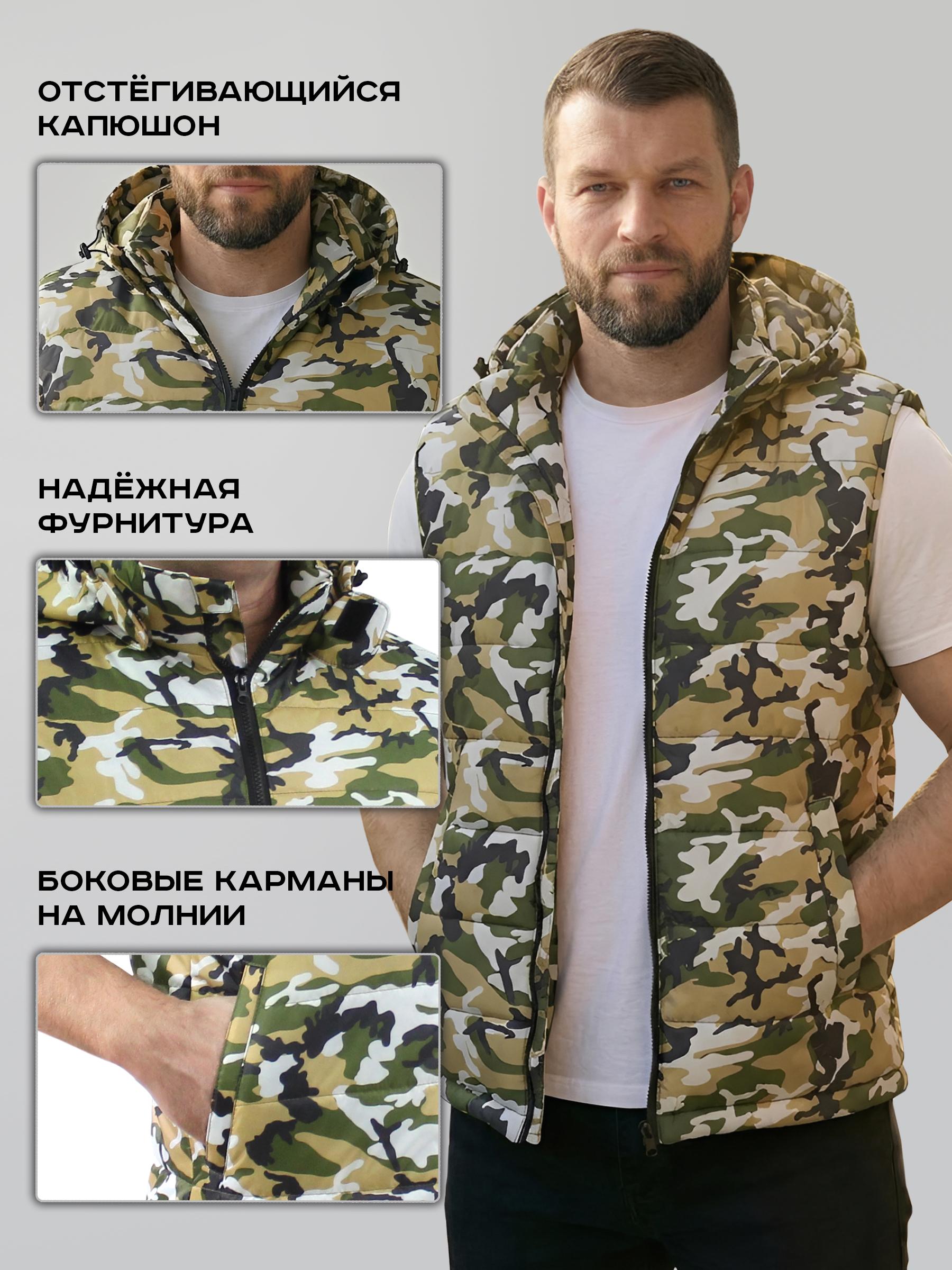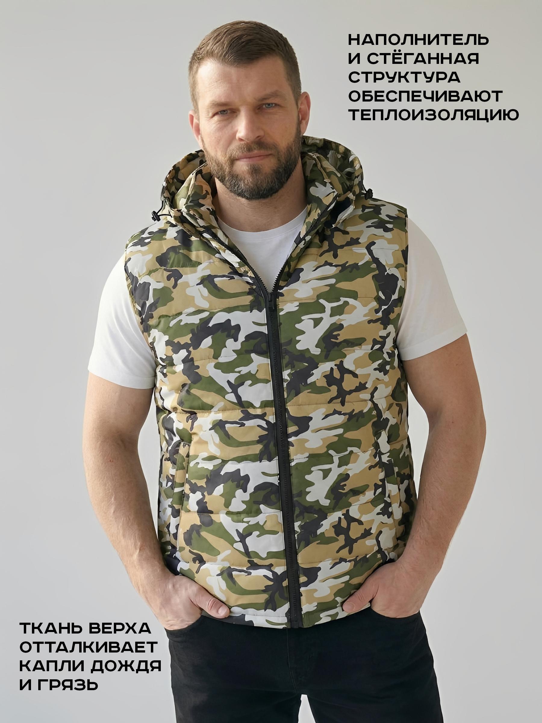 Жилет утепленный стеганный с воротником-стойкой и капюшоном. С внутренней стороны отделка - бязь. Застегивается на тракторную молнию. Имеются два наружных боковых кармана на молнии.